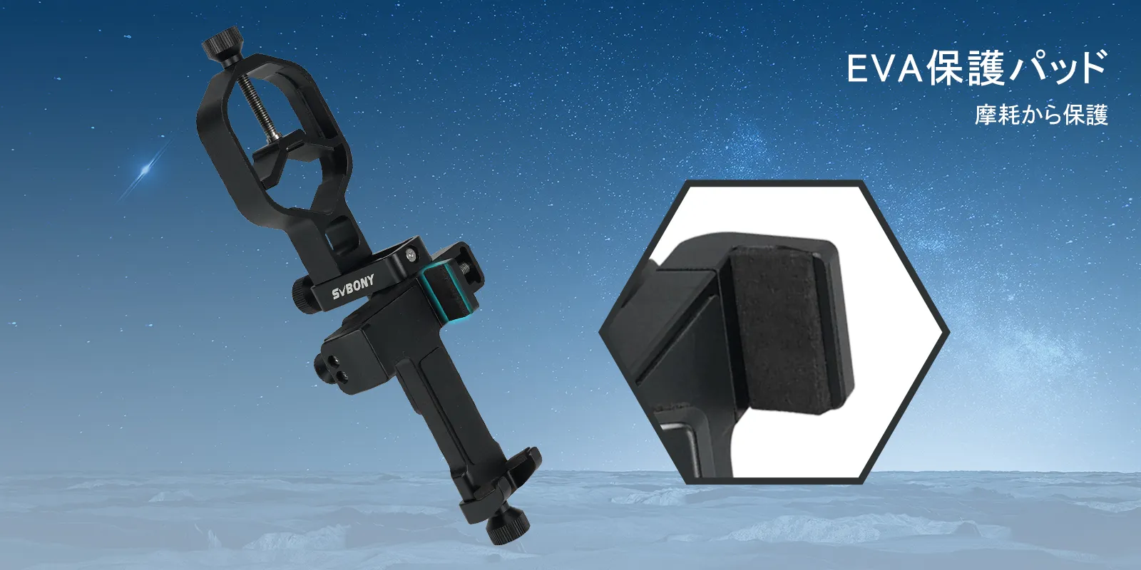 硬質アルミ合金製で頑丈。接眼レンズとスマートフォンを固定する部分には保護EVAパッドを採用し、機器への傷や摩耗を防ぎます。