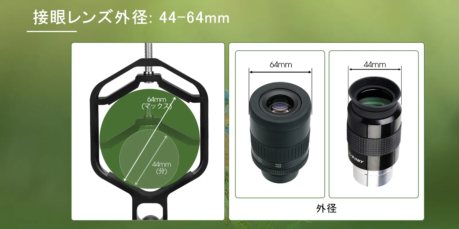 W9176A:接眼部外径44mm~64mmの光学機器に取付け可能.スマートフォンアダプターは、ほとんどの望遠鏡、フィールドスコープ、単眼鏡、双眼鏡、顕微鏡の外径44mm~64mmの接眼レンズを併用できます。