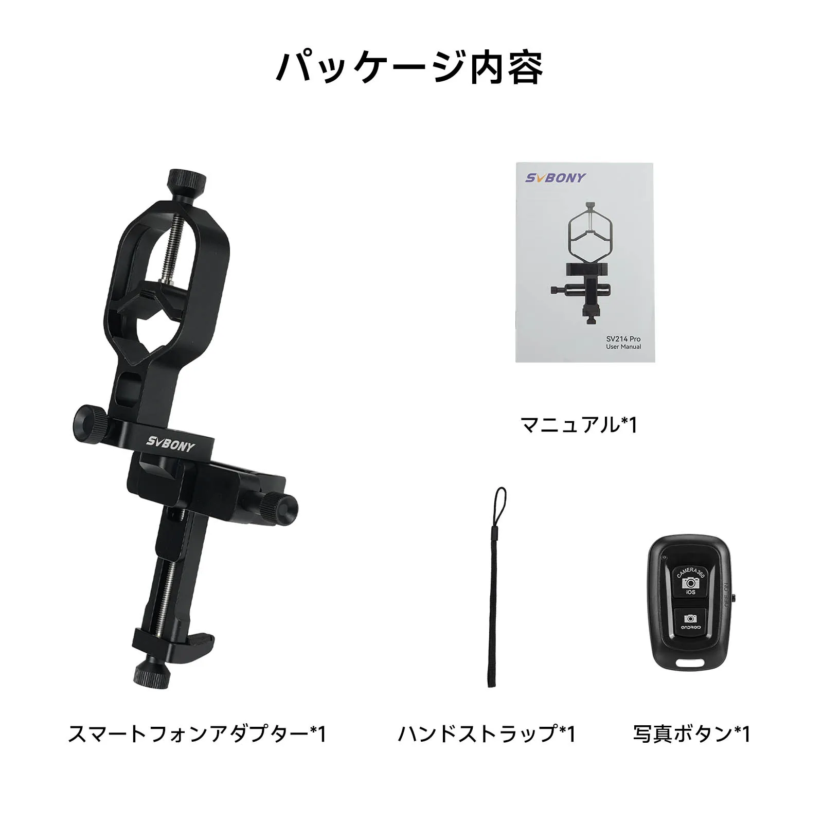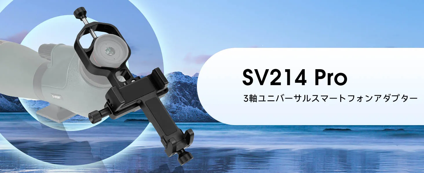SV214 Proユニバーサルスマートプホンアダプターは、上下・左右・前後の3方向に精密調整が可能で、スマートフォンのカメラを接眼レンズの中心に正確に配置します。専用の調整ノブにより最適なアイレリーフを簡単に設定でき、月や風景の鮮明な画像・動画撮影を実現。硬質アルミ合金製で頑丈かつ、EVA保護パッドで機器を傷から守ります。ほとんどのスマートフォンと光学機器に幅広く対応した多機能アダプターです。