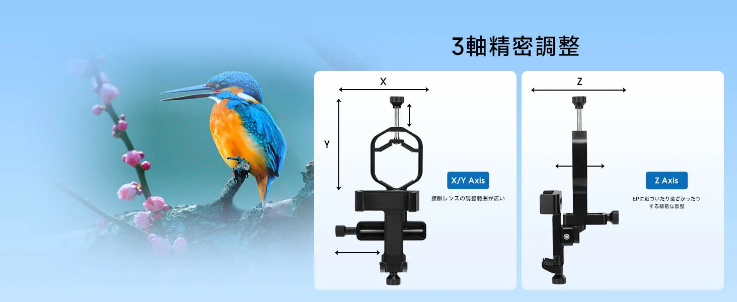 上下・左右・前後のあらゆる方向で高精度な調整が可能。スマートフォンのカメラを接眼レンズの中心に正確に配置します。