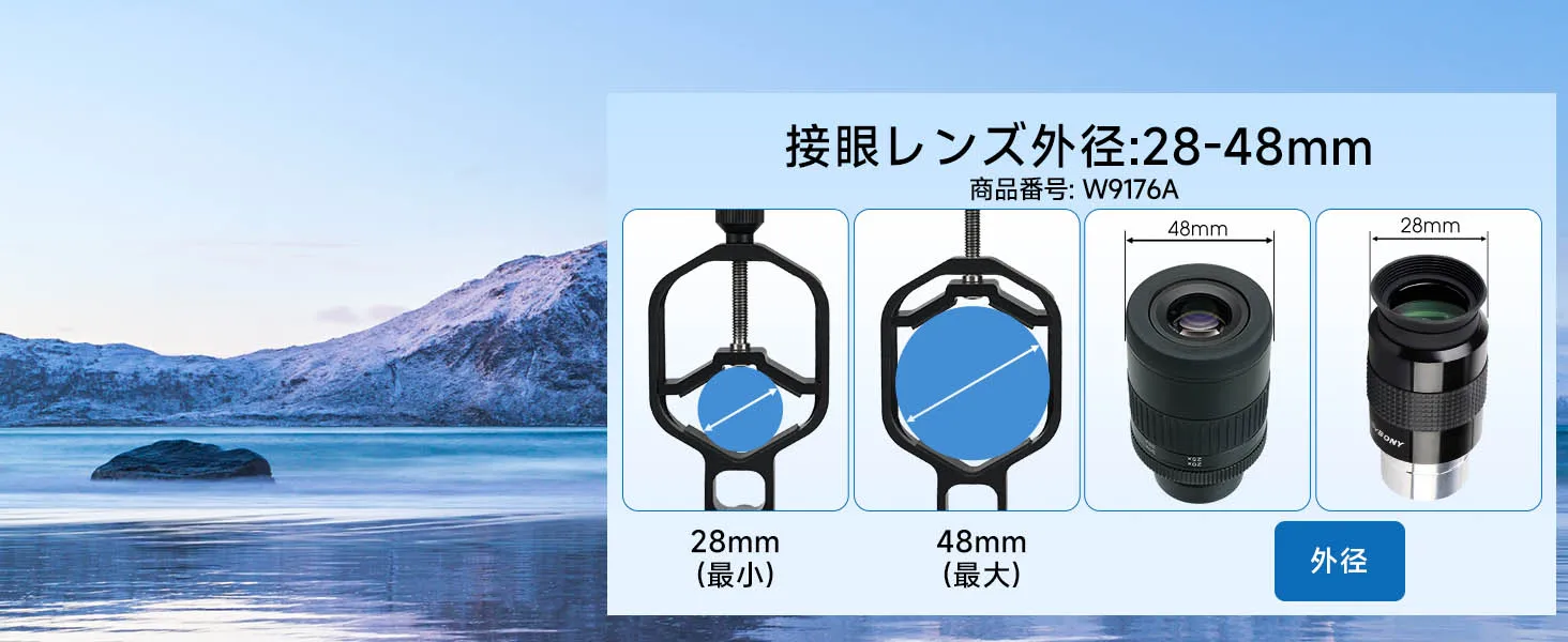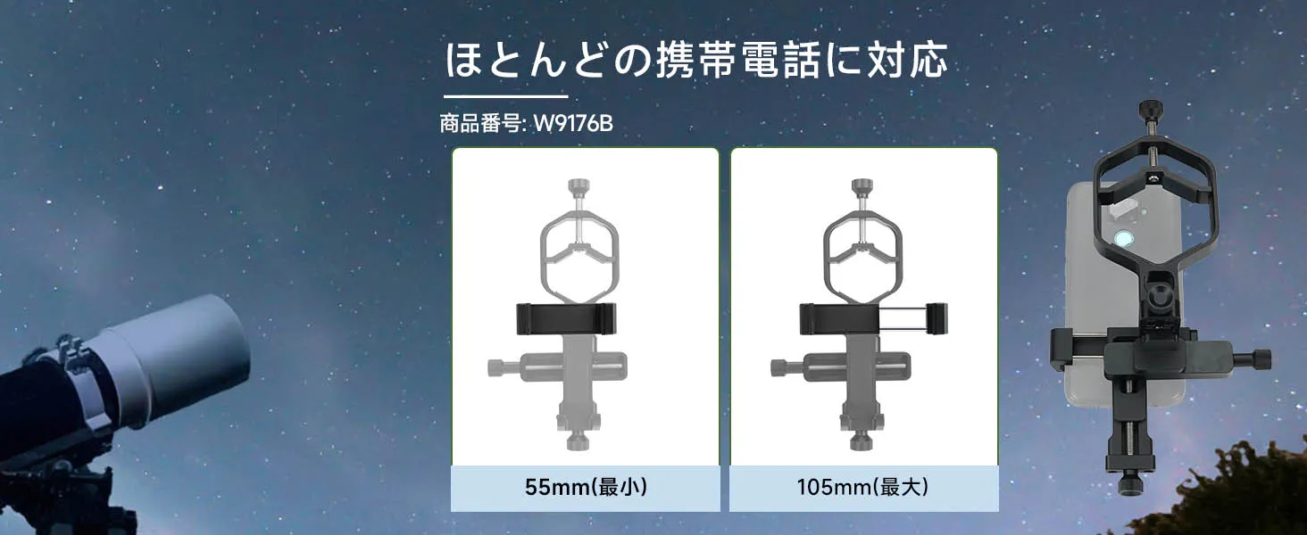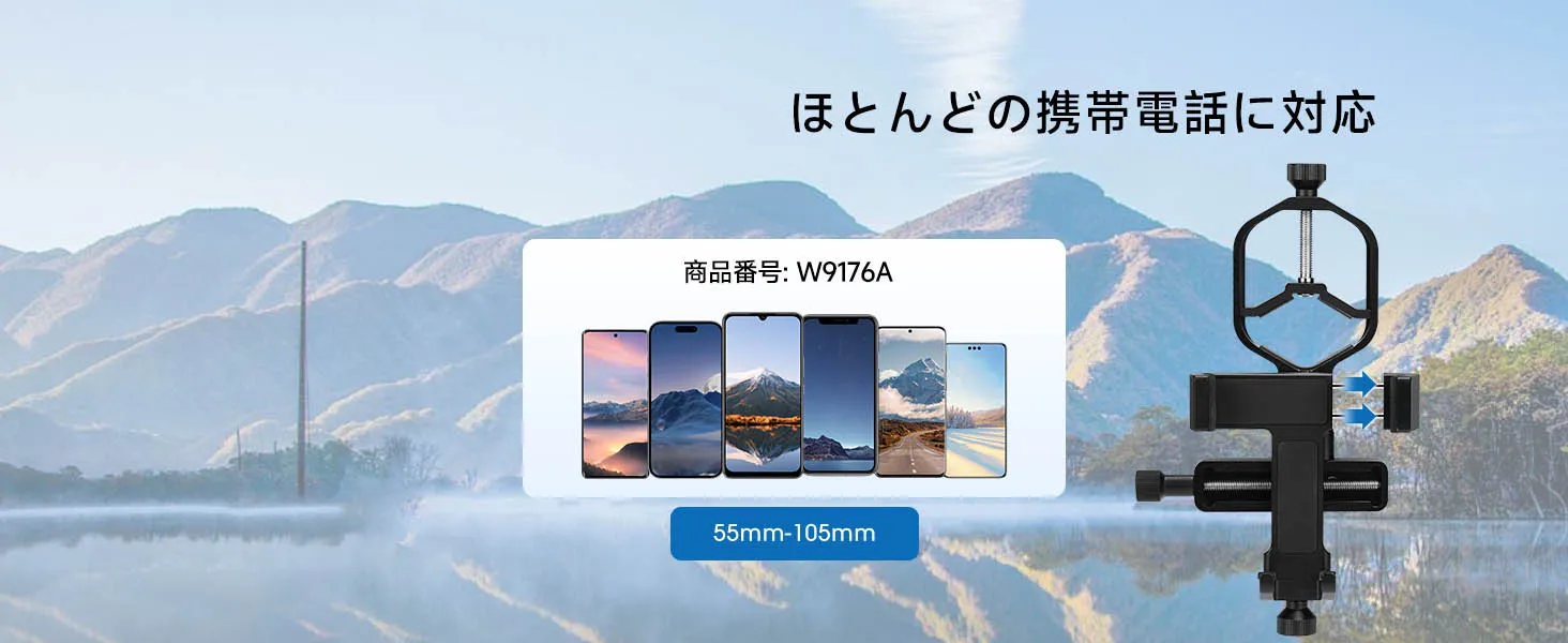 W9176A:幅55mm~105mmのほとんどのiPhone/Androidスマートフォン、および接眼部外径28mm~48mmの望遠鏡や双眼鏡など、多様な機器に対応しています。