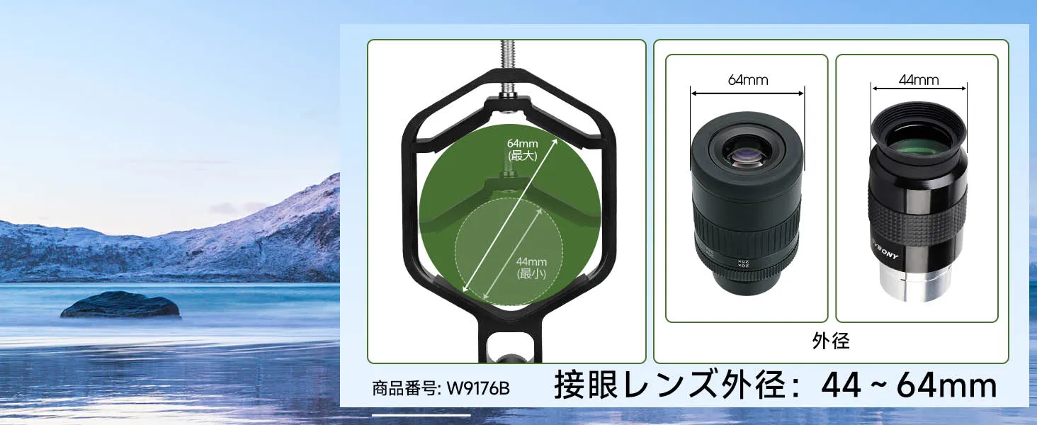 W9176A:接眼部外径44mm~64mmの光学機器に取付け可能.スマートフォンアダプターは、ほとんどの望遠鏡、フィールドスコープ、単眼鏡、双眼鏡、顕微鏡の外径44mm~64mmの接眼レンズを併用できます。