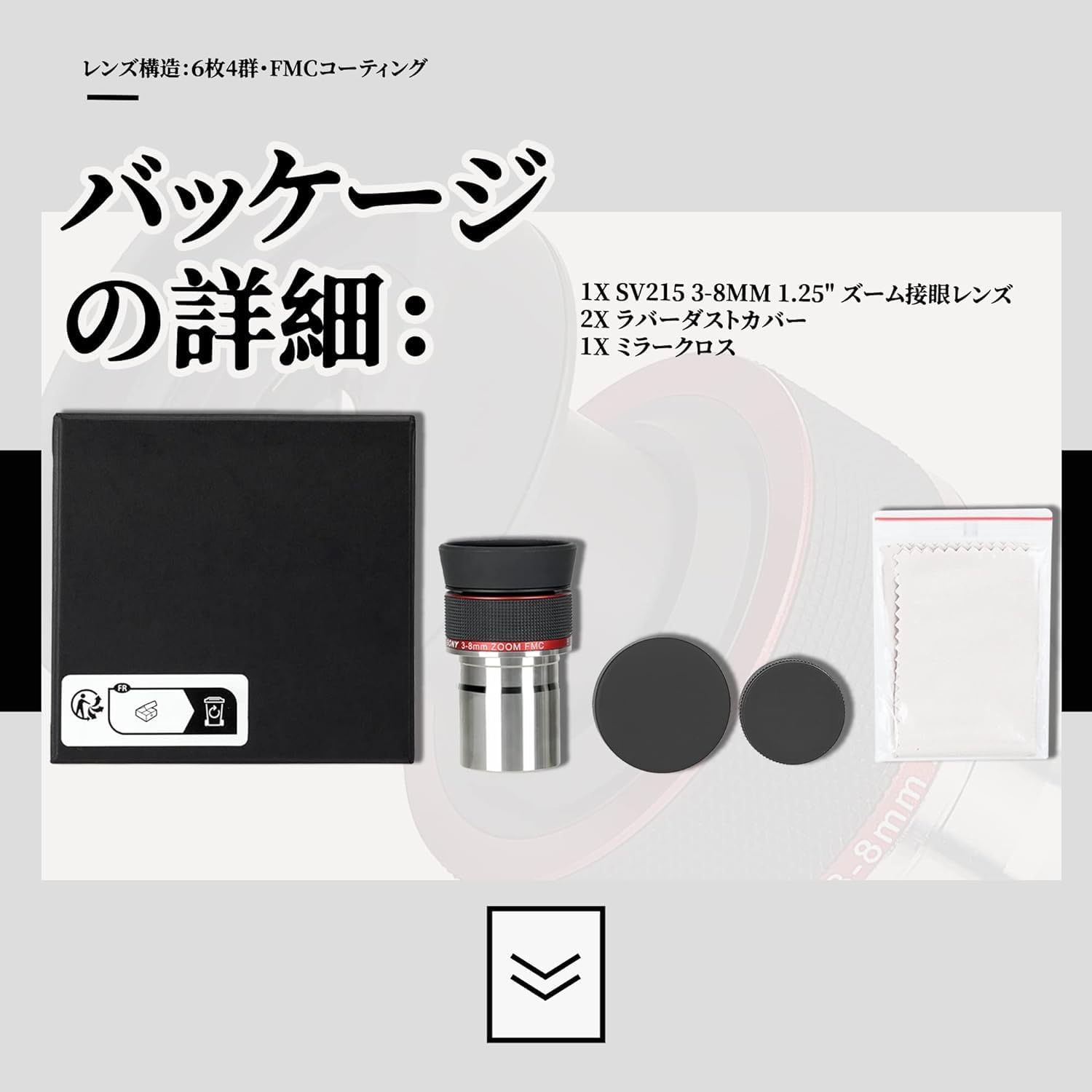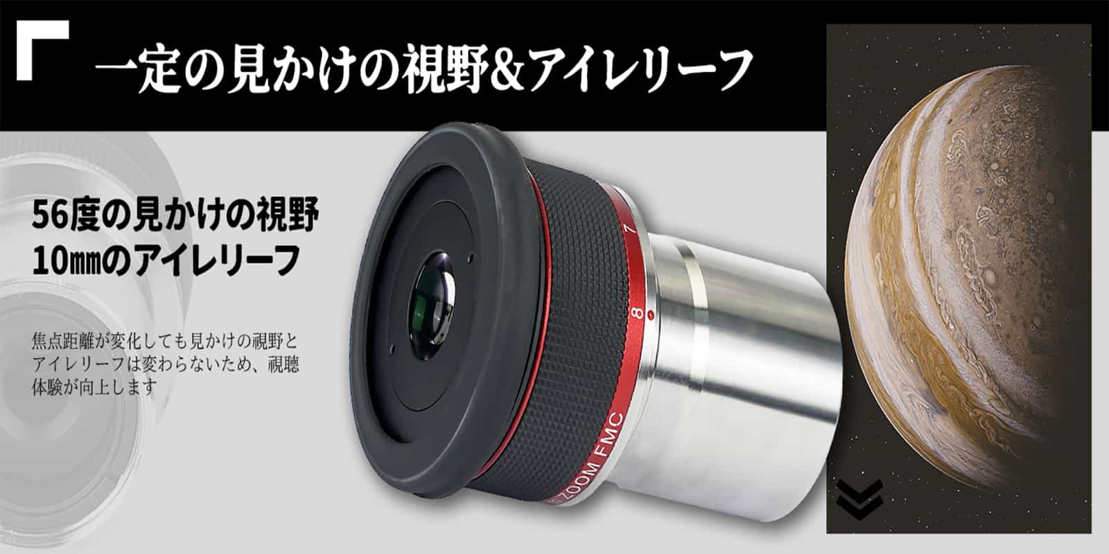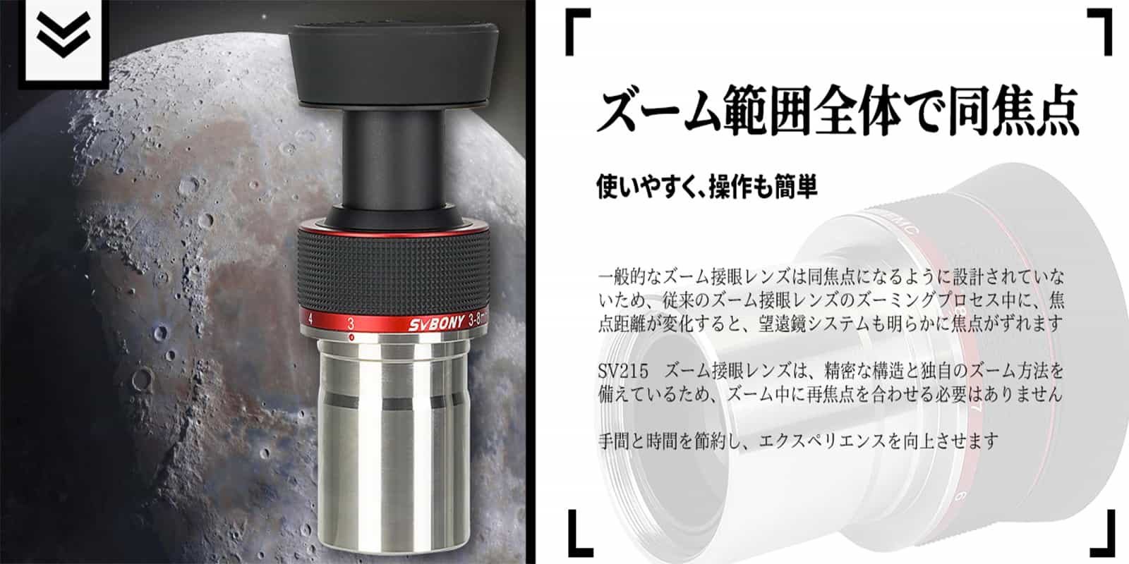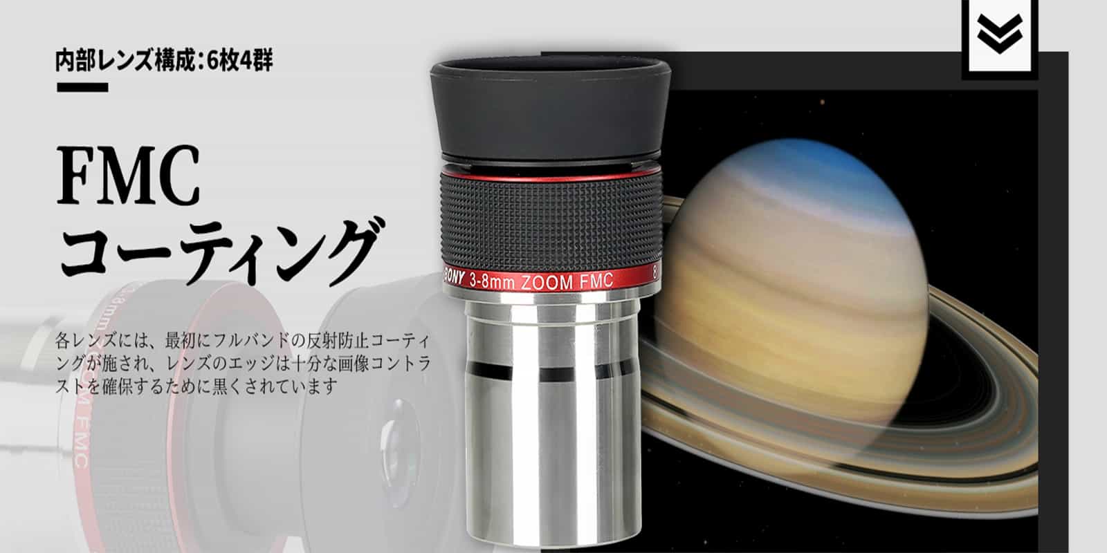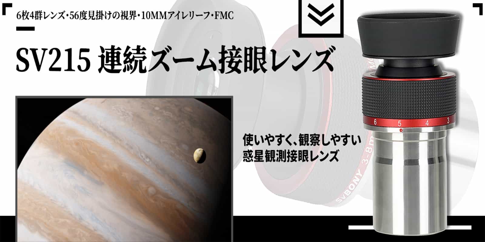 8 | ReviewsSV215ズームアイピースは、月・惑星を高倍率で観測するときに使いやすい倍率、覗きやすい視界を優先して設計されたアイピースです。3-8mmのズームでズーム全域で見かけ視界56°です。