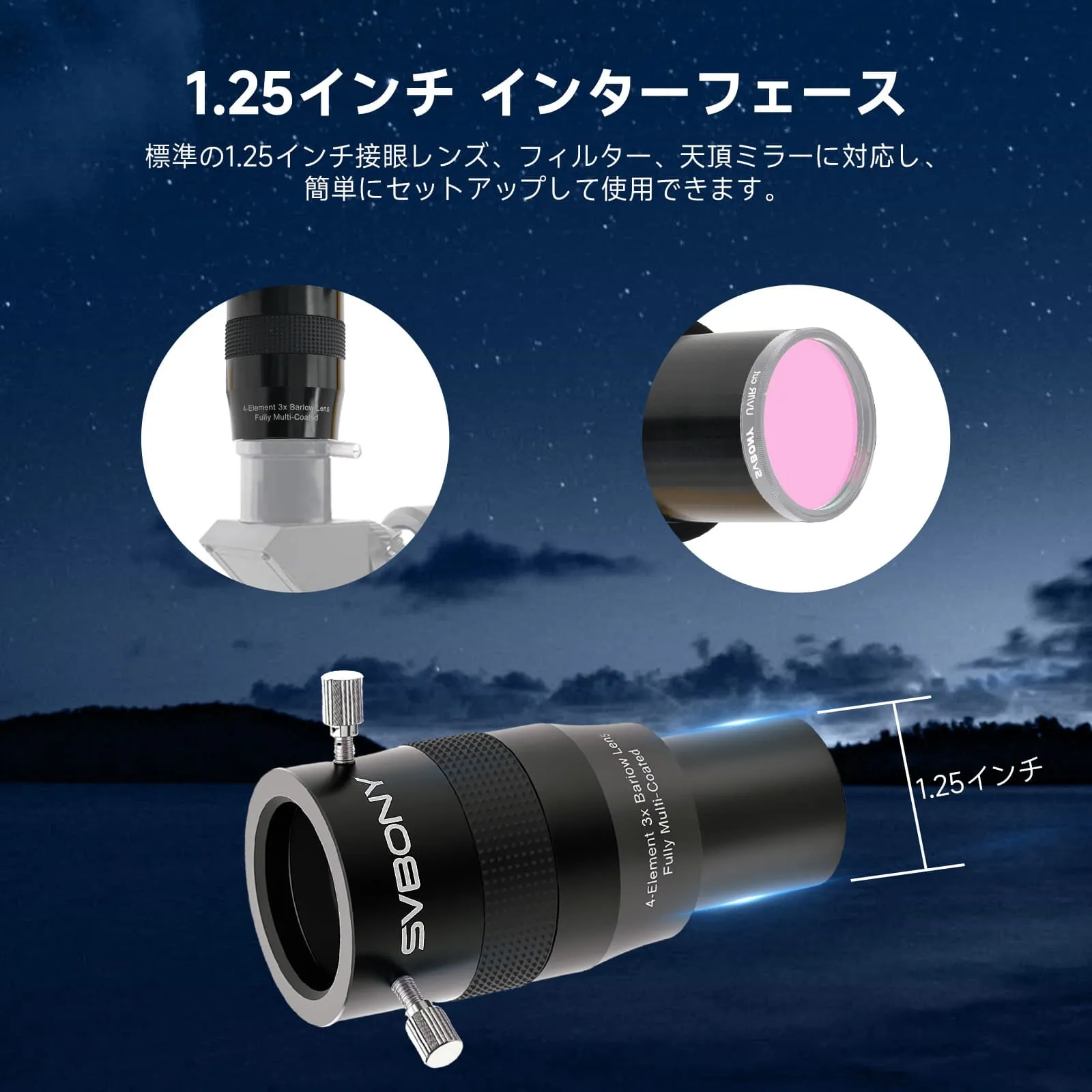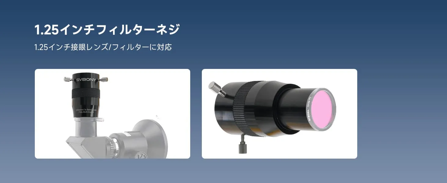 ・優れた互換性と使いやすさ: 標準的な1.25インチインターフェースを採用しており、ほとんどの接眼レンズや天頂ミラーなどと容易に接続でき、セットアップが簡単です。