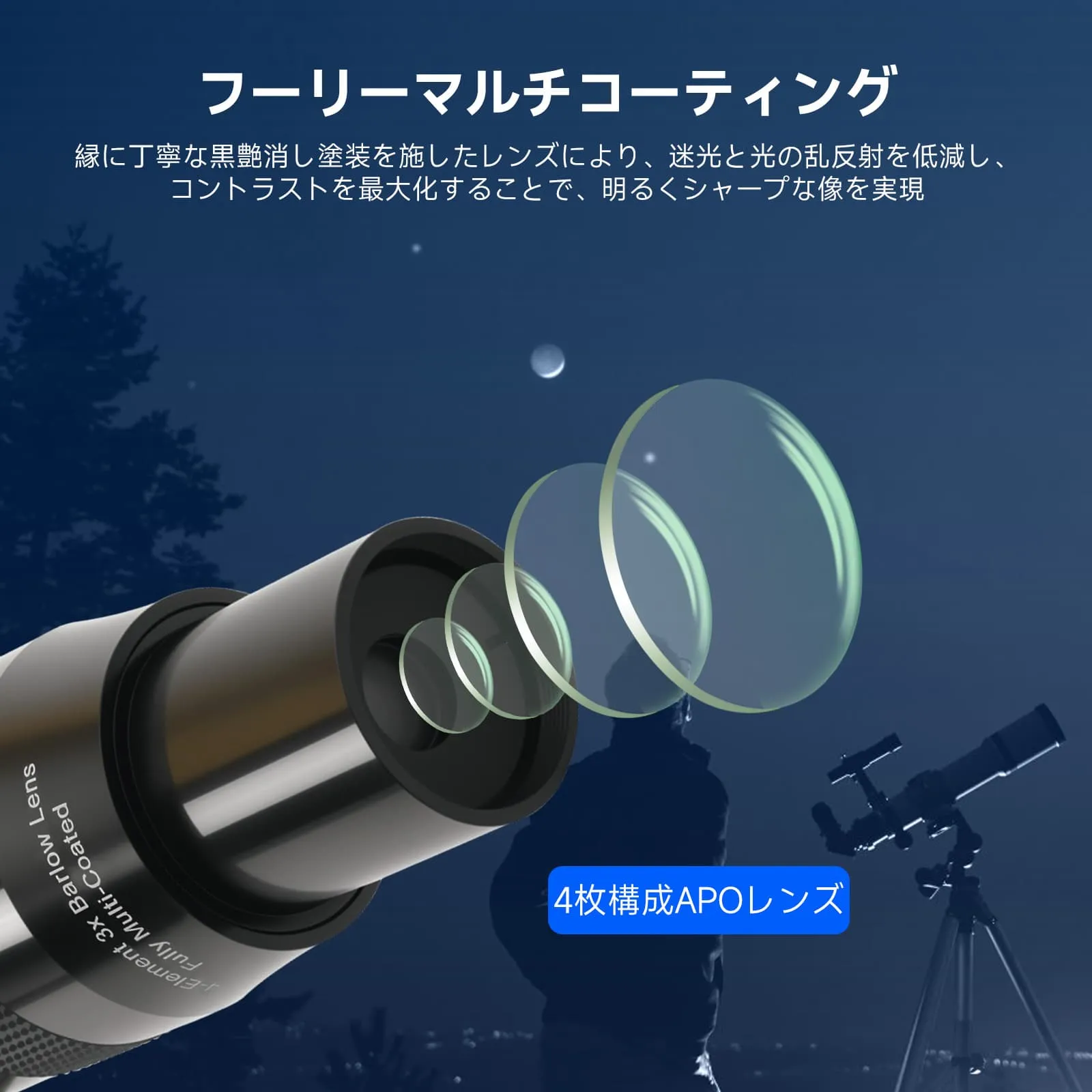 ・高精度光学性能: 3倍の倍率を実現します。4枚のレンズ全てに施されたフーリーマルチコーティングとエッジの黒色コーティングにより、光の透過率を高め、不要な反射やハロー、歪みを大幅に低減し、シャープで高コントラストな像を提供します。