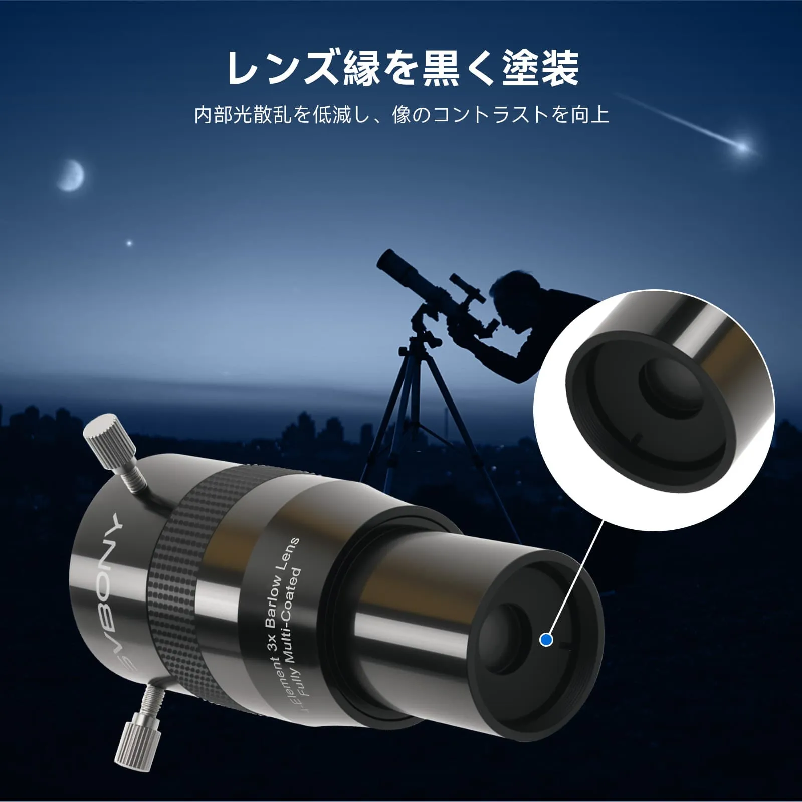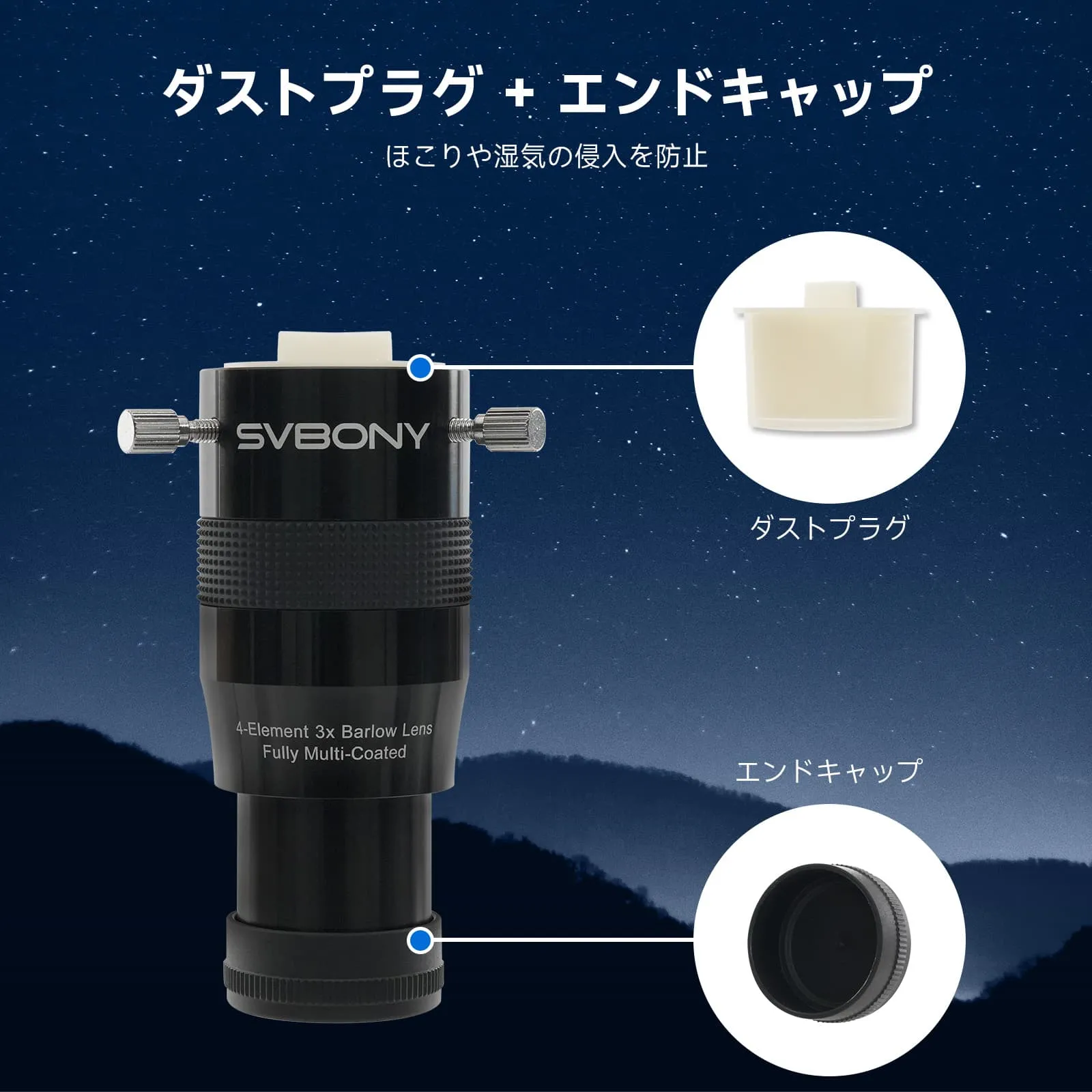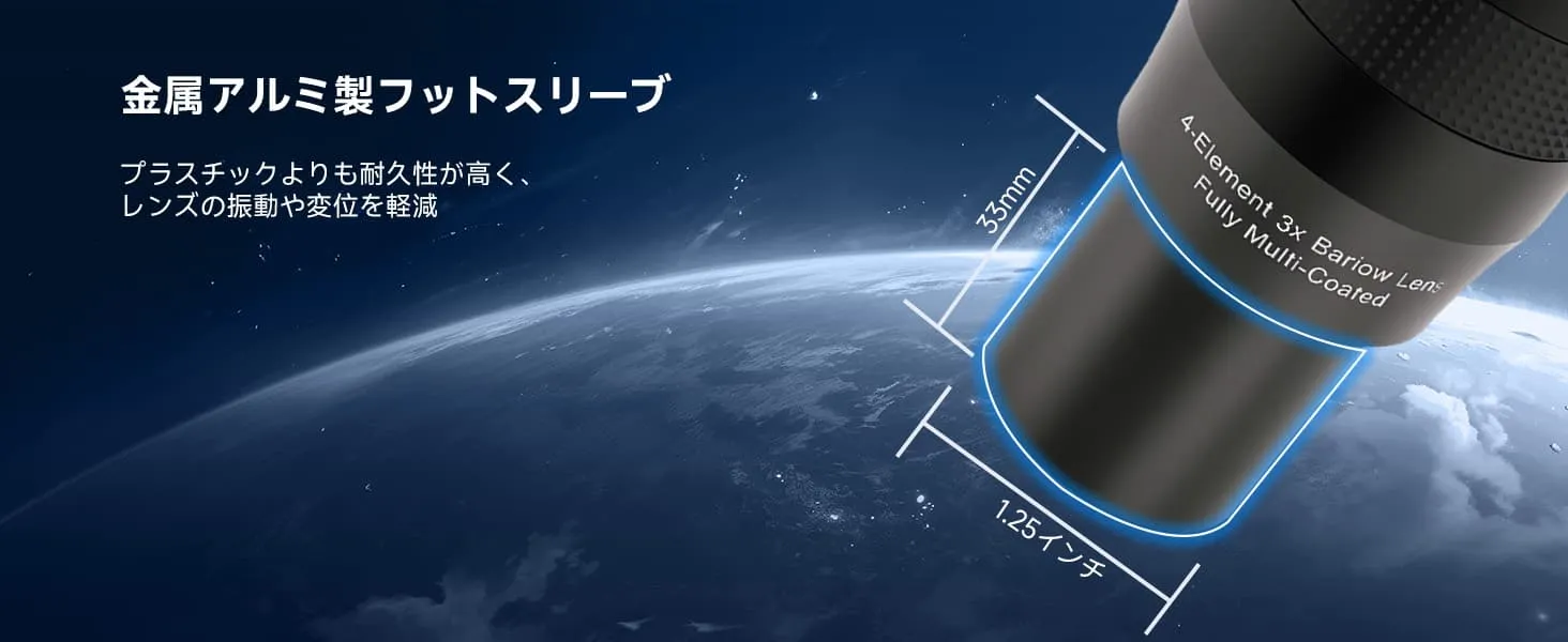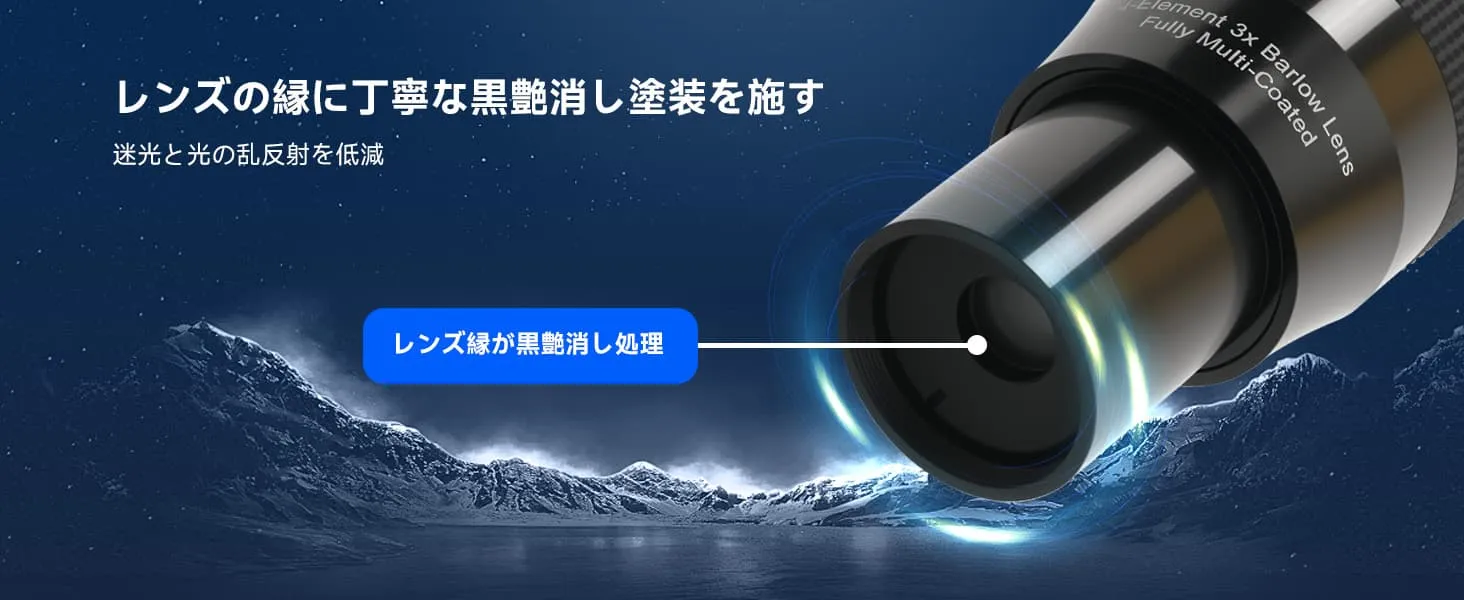 ・快適な観察体験: 高倍率の接眼レンズ単体使用と比べて、快適な射出瞳距離を保ちながら高倍率を達成。付属のダストキャップとエンドキャップがレンズを保護し、製品寿命を延ばします。