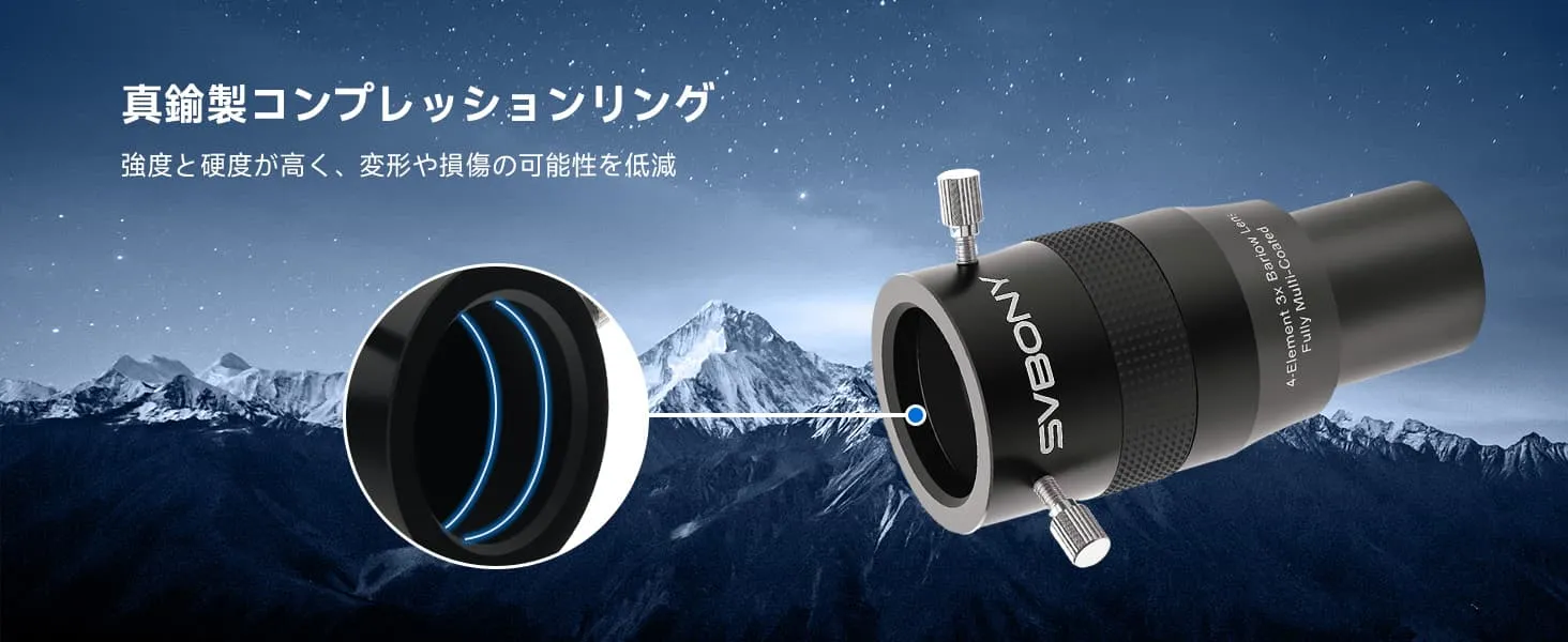 ・堅牢で信頼性の高い構造: 高品質なアルミニウム合金ボディと高強度の真鍮製コンプレッションリングを採用することで、比類ない耐久性と変形防止を実現。観測中の安定性を確保します。