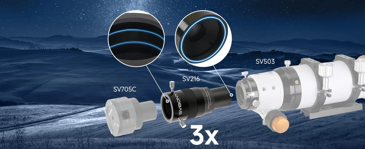 SV216 1.25インチ 3倍バーローレンズで望遠鏡の性能を向上させましょう。3倍の拡大率を提供し、歪みを最小限に抑えたクリアで高精細な視界を実現します。縁に丁寧な黒艶消し塗装を施したレンズが反射を軽減し、アルミニウムフレームと3本ネジロックシステムが安定性を確保します。真鍮製圧縮リングが変形を防ぎ、1.25インチインターフェースで容易な互換性を実現します。