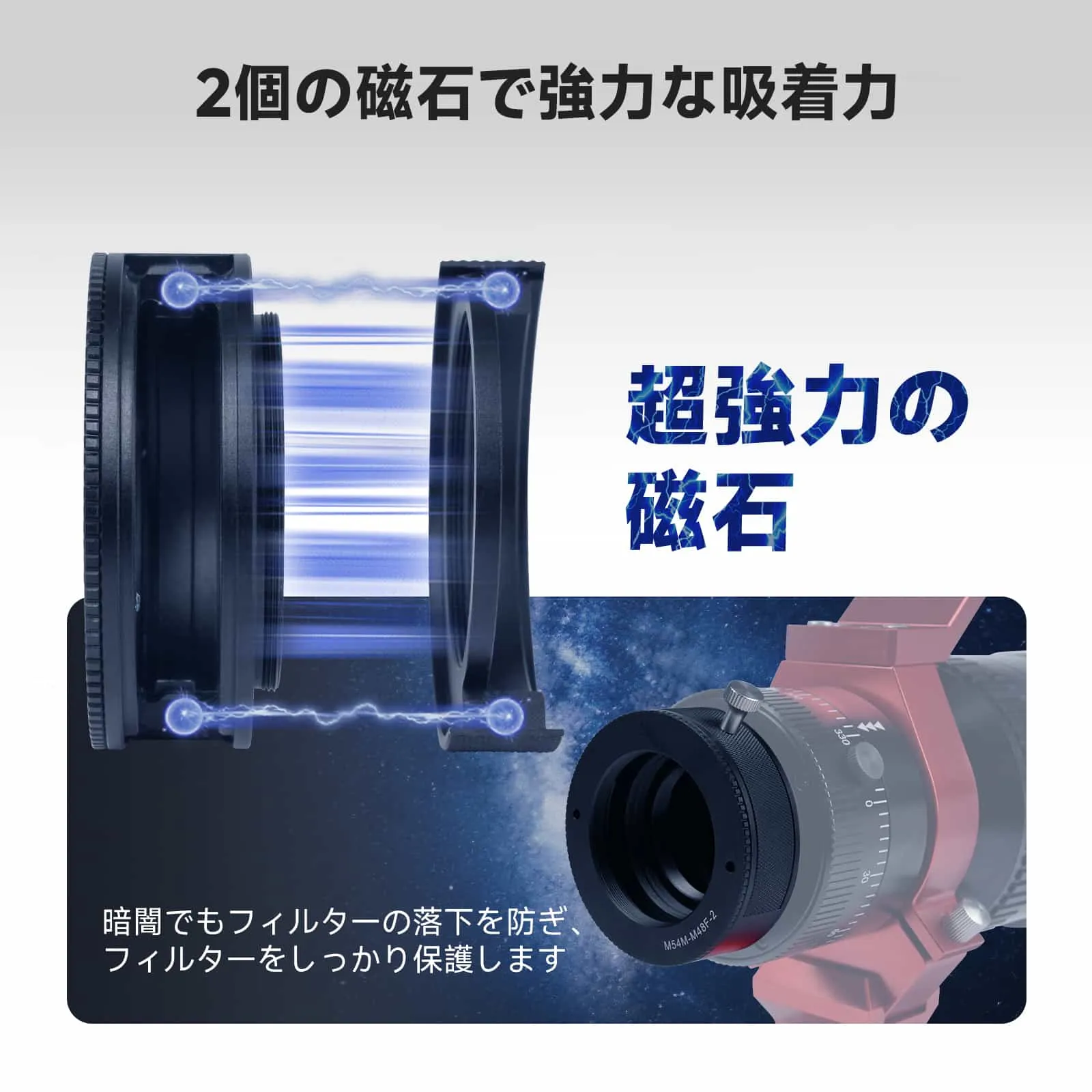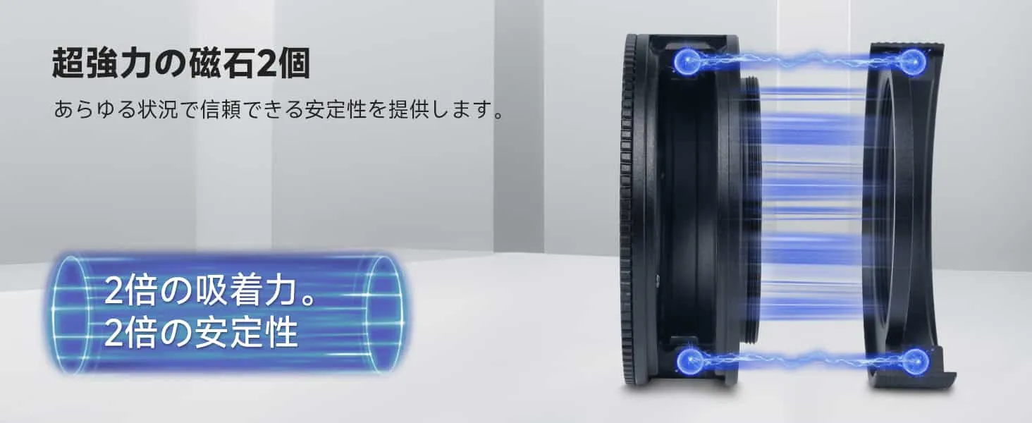 【デュアルマグネット】 デュアルマグネット設計により、二重のロック力でフィルターをしっかりと安定して固定し、不意の脱落リスクを大幅に低減します。コンパクトな外観と強力な磁気吸着力により、フィルターを確実に保護します。観察に集中できます。