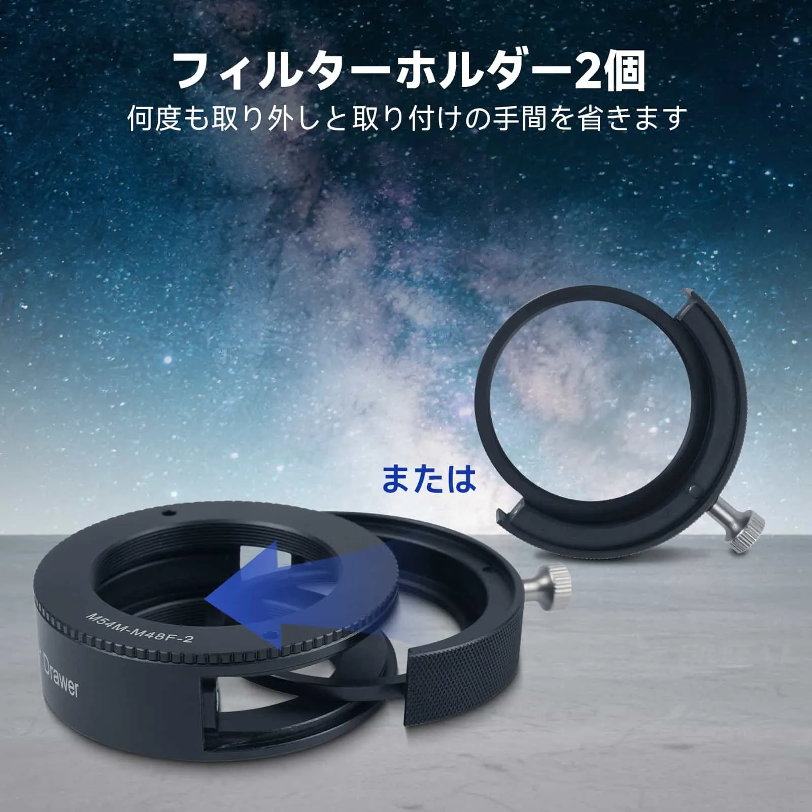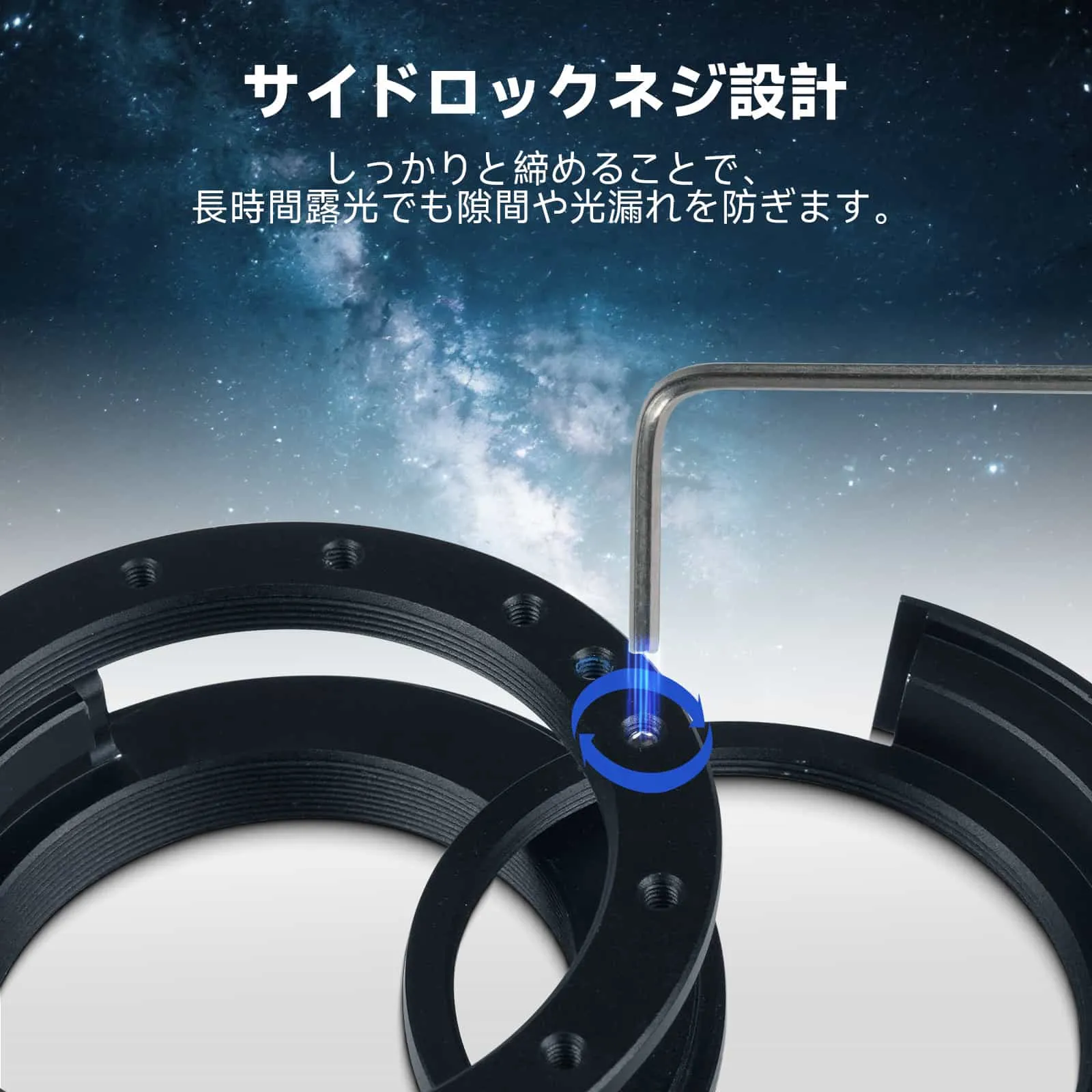 【光漏れ防止ロック構造】 精密なロックネジを装備し、フィルターとホルダーの隙間を完全になくし、長時間露光撮影時の光漏れを防止します。タイトな設計により、画像の純度を確保し、深宇宙撮影の画質を向上させます。