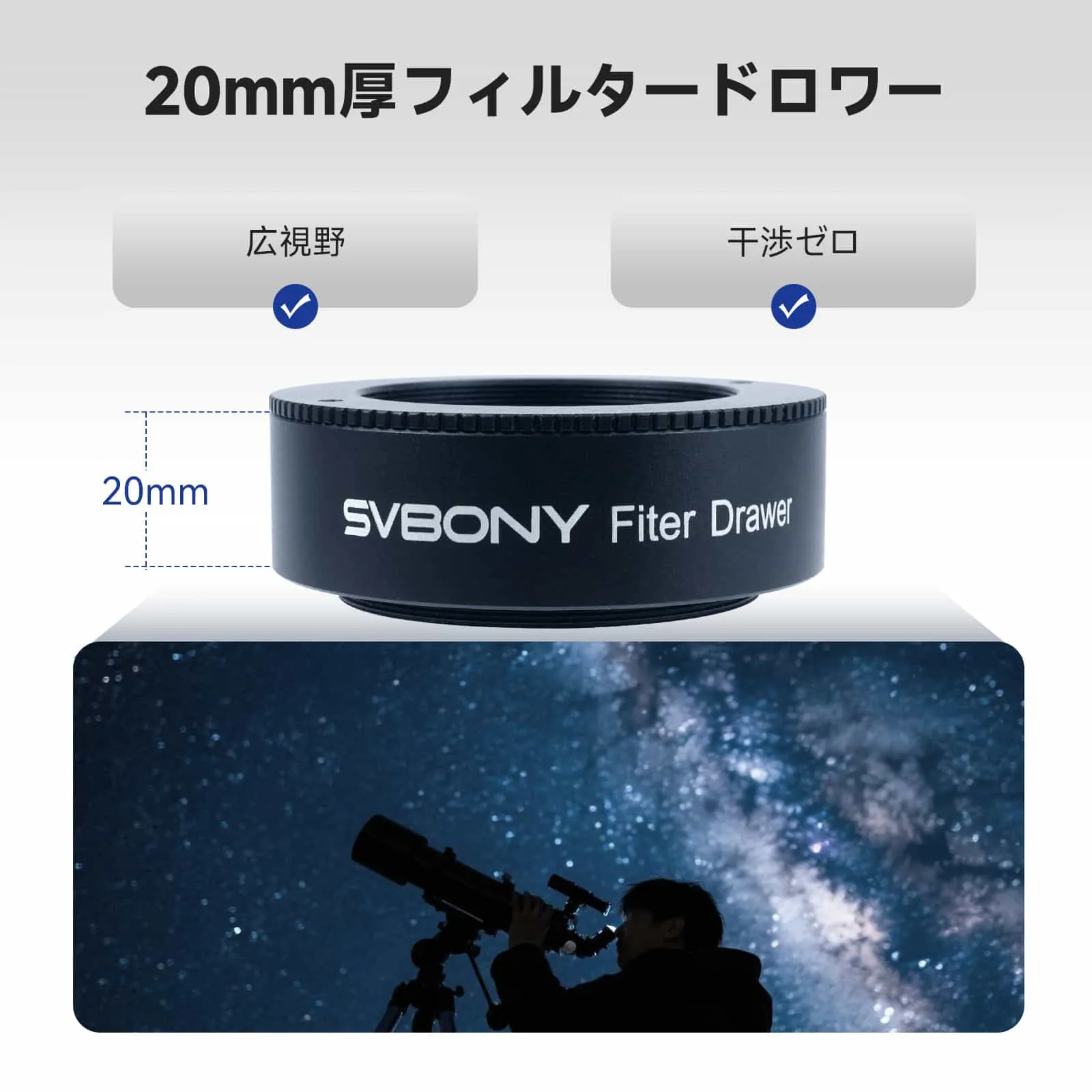 【20mmの超薄型】 科学的に最適化された20mmの薄型設計により、広角観察における暗い隅や視野の遮蔽を回避します。光透過率を最大限に高めることで、鮮明なエッジイメージングを実現し、特に広視野角の深宇宙ターゲットの撮影に最適です。