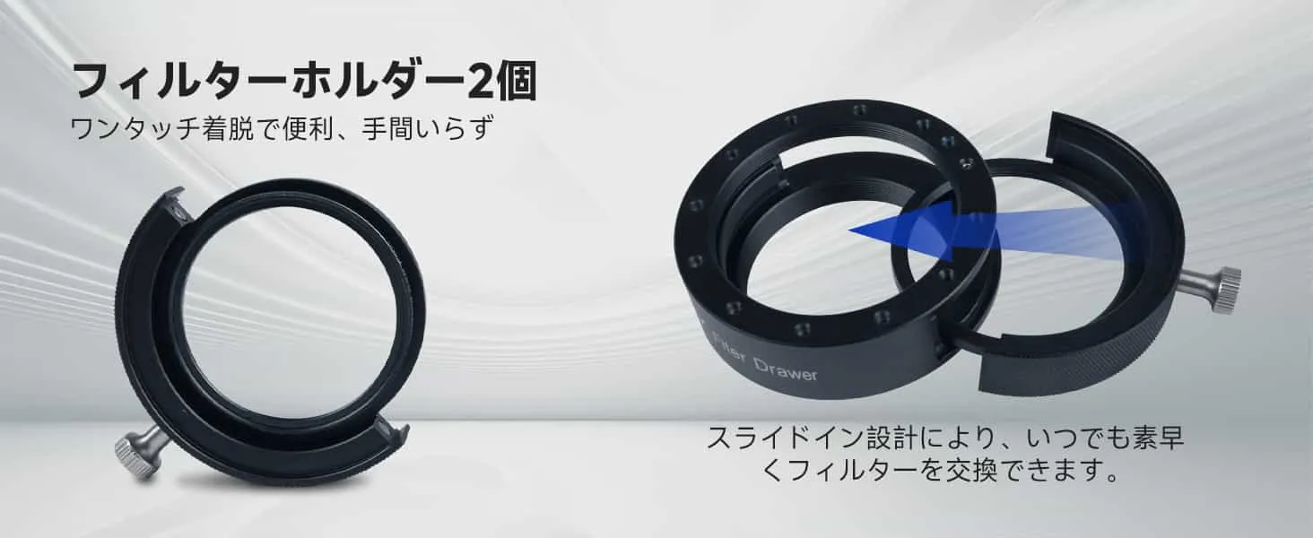【デュアルフィルター高速切り替え】 2枚のフィルターを同時に装着し、高速切り替えが可能です。フィルター交換時間を大幅に短縮し、観察効率を向上させます。特に、フィルターの頻繁な切り替えが必要な天体撮影シーンに最適で、重要な瞬間に作業を中断することなく撮影できます。