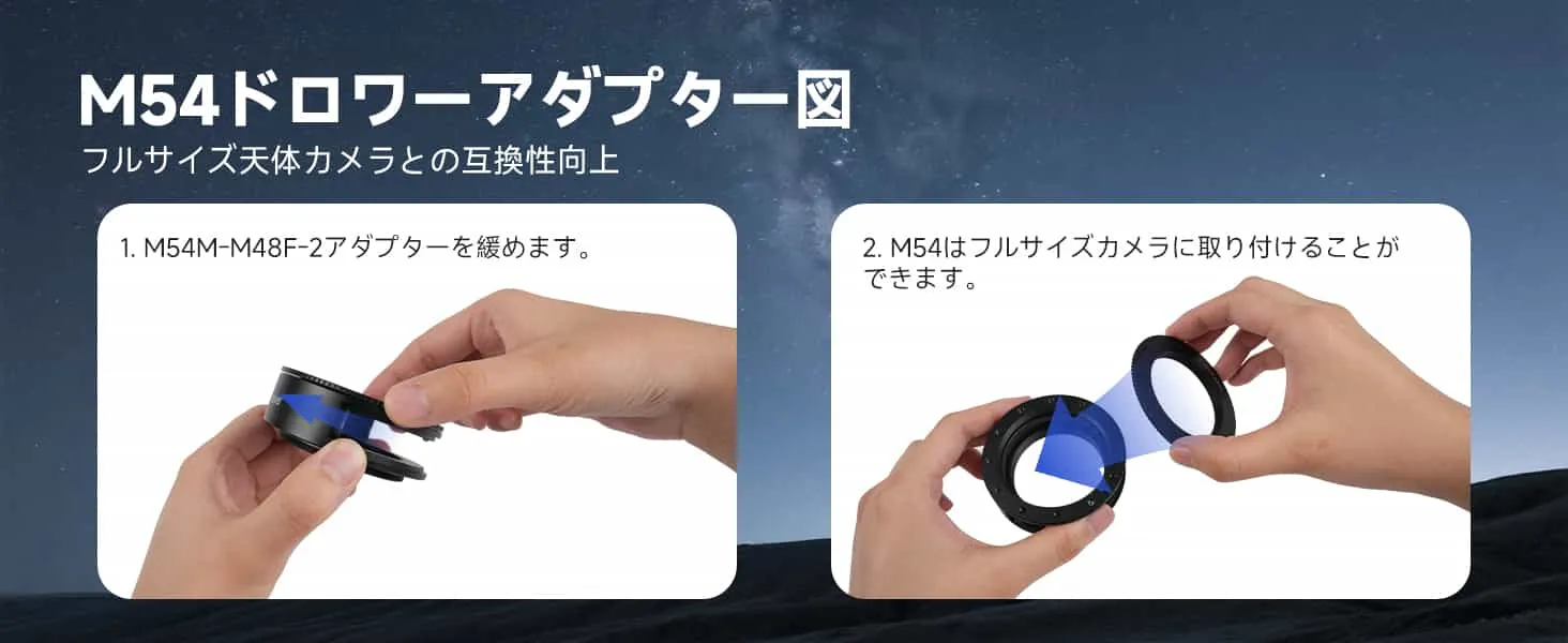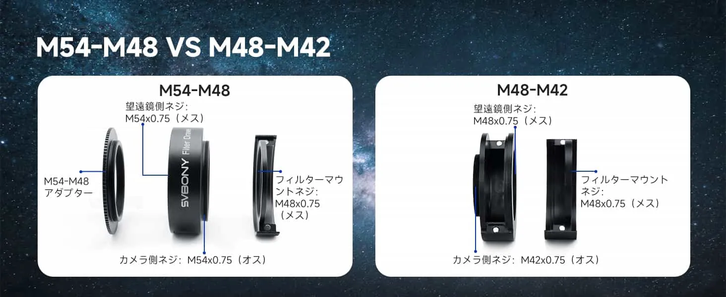 | 望遠鏡側 | M48 × 0.75 (メス) | M54 × 0.75 (メス) | めねじ M2.5 |
