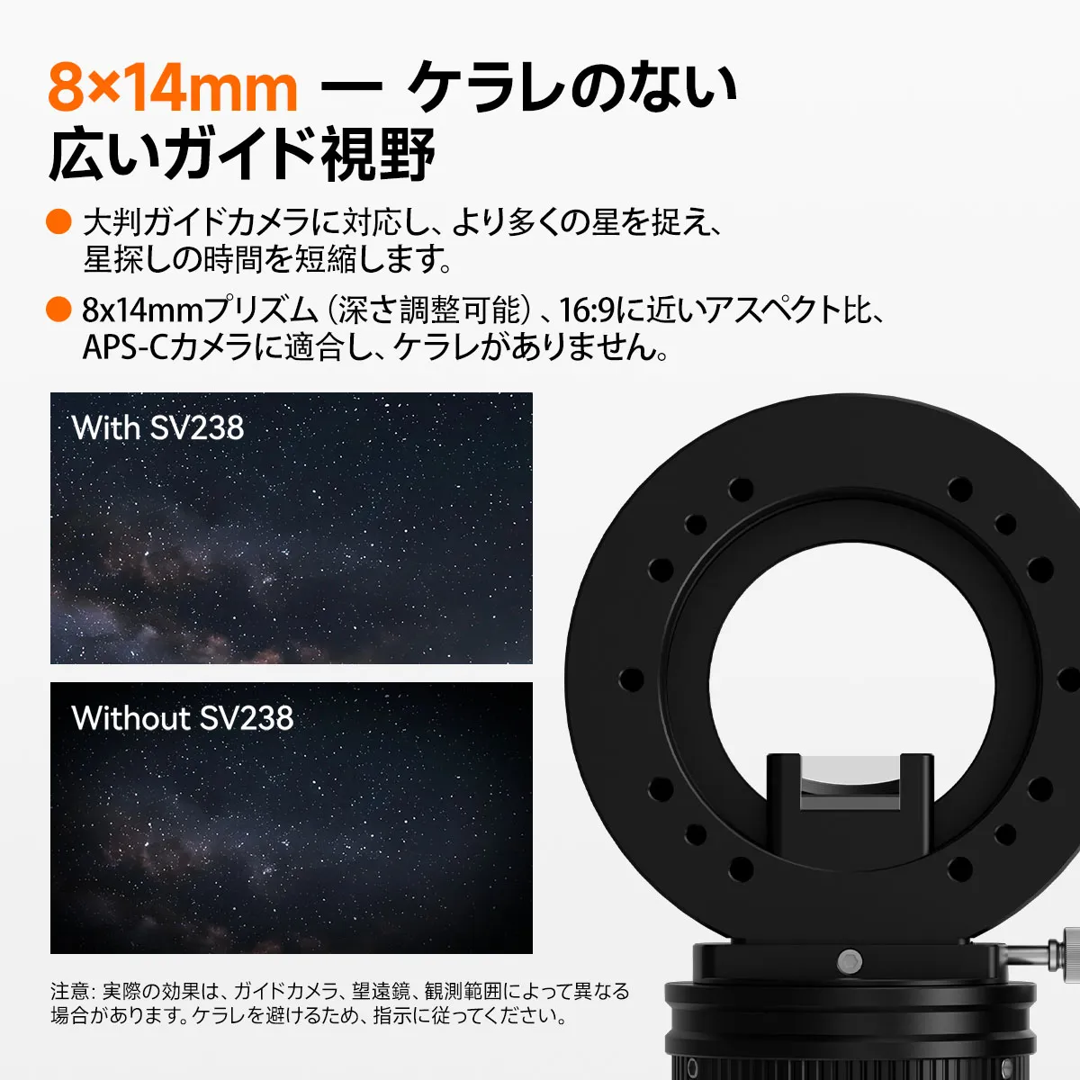 ※最大APS-Cまでのイメージセンサーを搭載したカメラの使用をお勧めします。SV238はフルサイズカメラとの組み合わせも可能ですが、周辺にケラレ(暗角)が生じる可能性があります。フルサイズカメラのご使用を希望される場合で、ケラレが発生しても問題ないという方は、ダークフレームなどの補正処理を行うことで除去することも可能です。