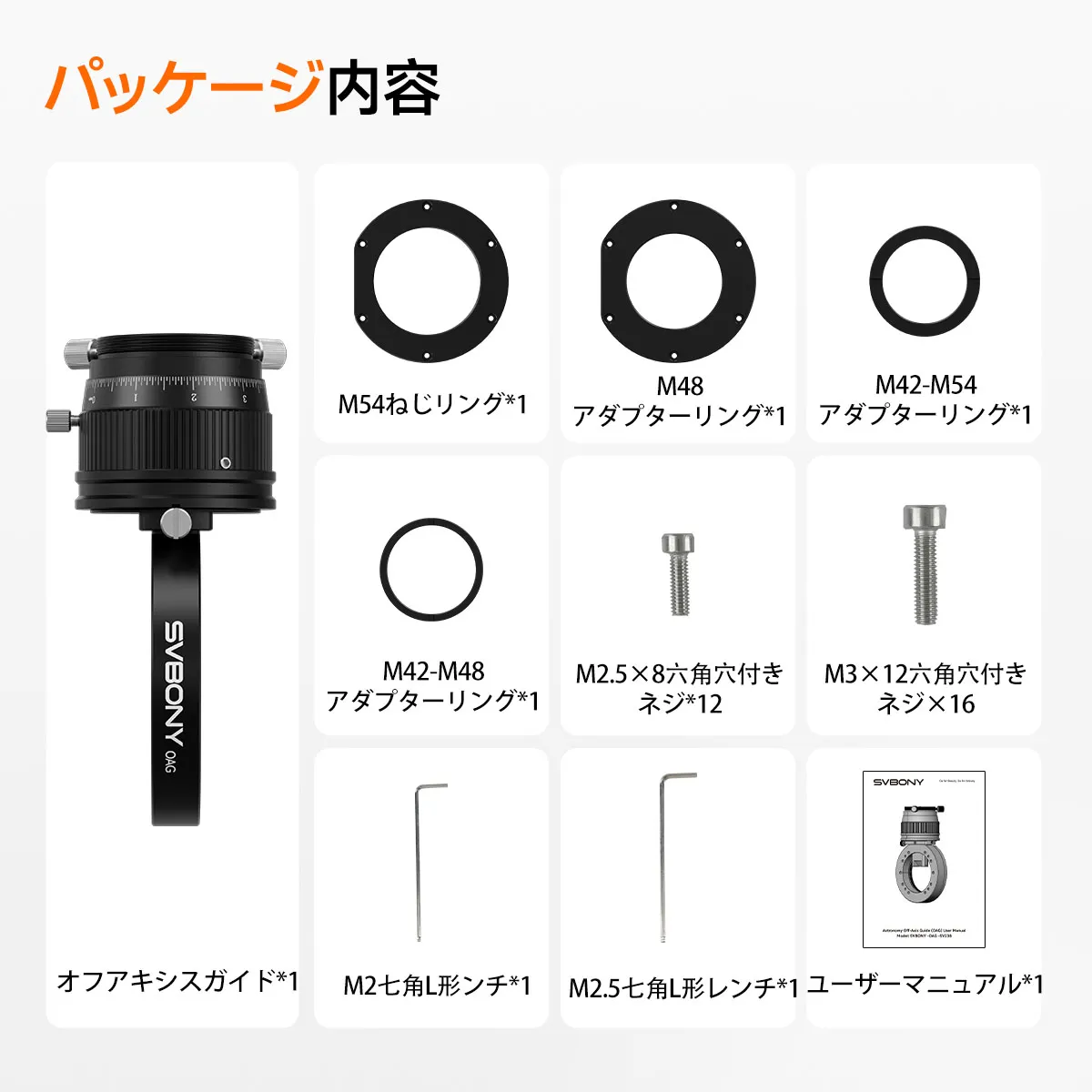 Write a reviewSV238オフアキシスガイダー(OAG)は天体写真の精度を向上させるアクセサリーです。撮影用の鏡筒とカメラの光路間に設置し、メインカメラのセンサーに投影される像の一部を借用してガイドを行う仕組みのことです。大型プリズムはより多くの光を捉え、星の少ない環境でもガイド星を見つけやすくすることで、ガイドの成功率と安定性を飛躍的に向上させます。M54、M48、M42というユニバーサルインターフェースの望遠鏡に対応します。調整可能なプリズムにより、ガイドスターを簡単にします。