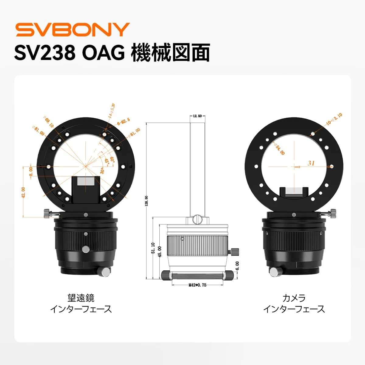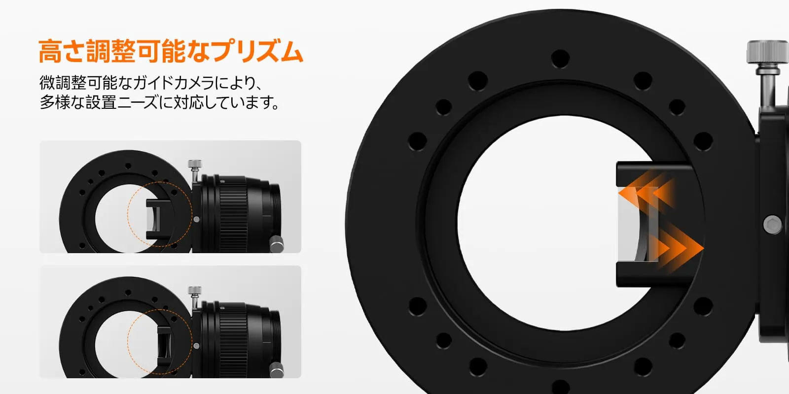 3、高い互換性:M54/M48/M42といった多様なインターフェースを備え、様々な望遠鏡システムに柔軟に対応します。さらにプリズムの高さを調整できるため、ガイドスターを簡単にします。