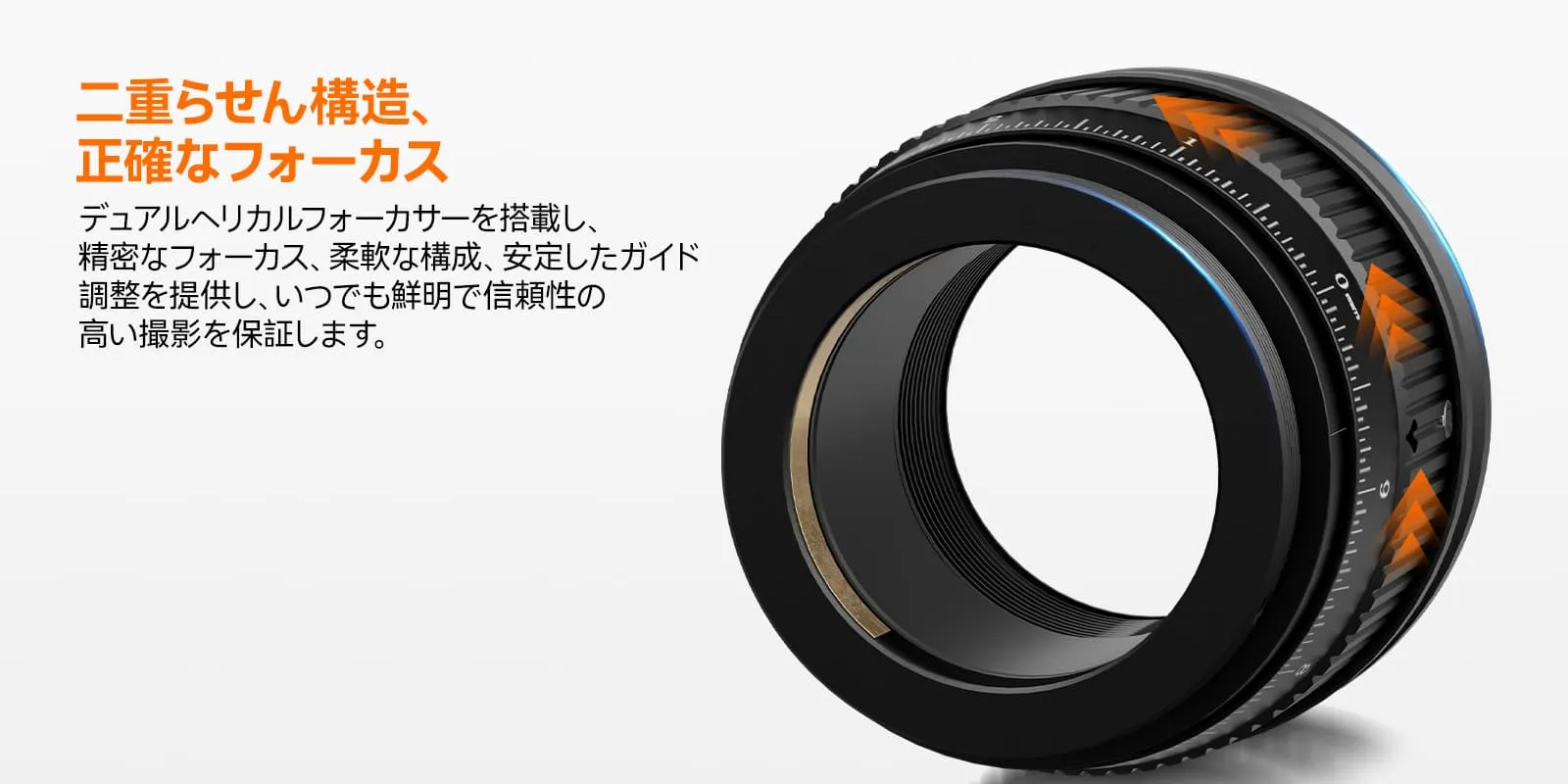 2、精密なデュアルヘリカルフォーカサー:二重のヘリカル構造による微調整機能で、スムーズかつ精密なピント合わせを実現します。素早く正確に焦点を固定し、ガイドの失敗による画像のブレを防ぎます。