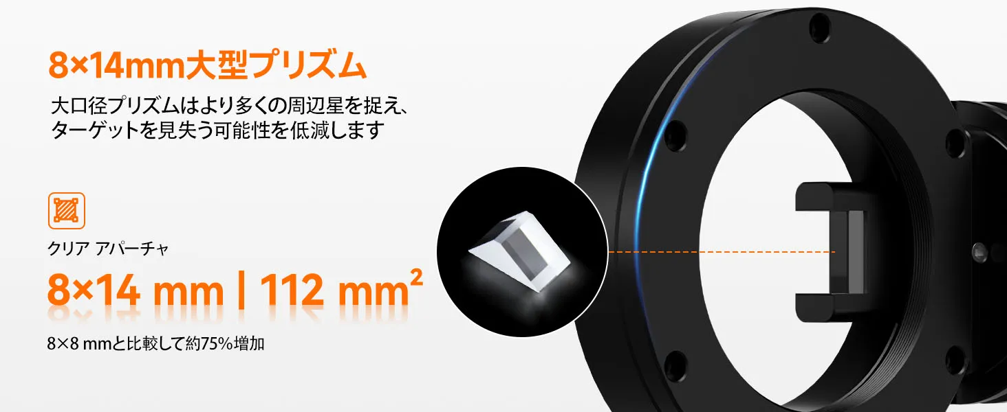 1、大型プリズムによる高感度ガイド:8×14mm 大型プリズムにより多くの光を集め、視野が広いため、星の少ない環境でもガイド星を捉えやすく、天体写真の精度が向上します。