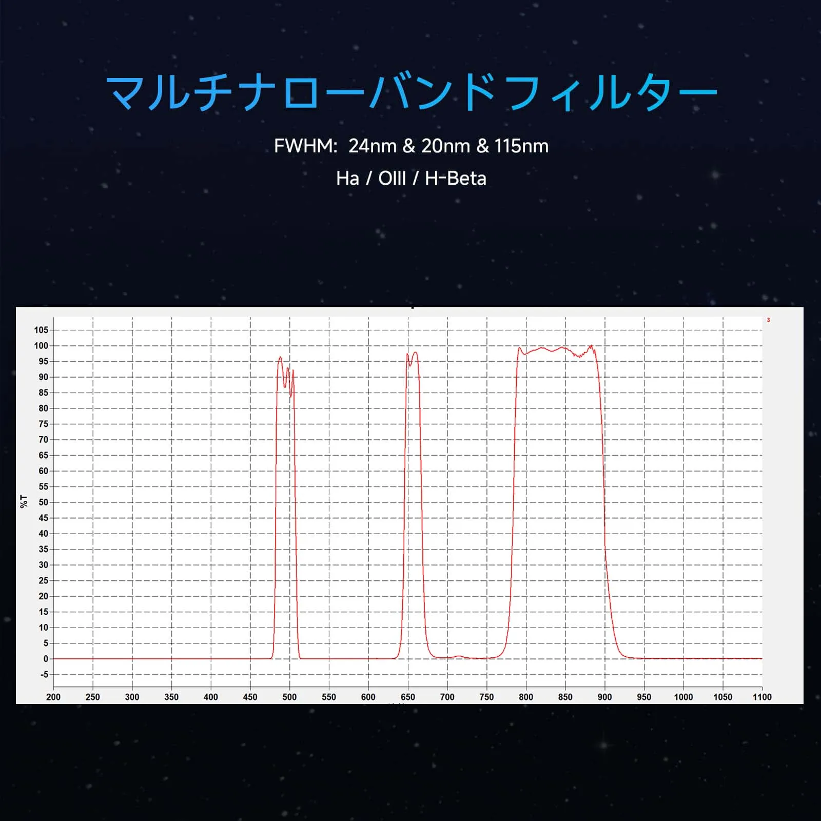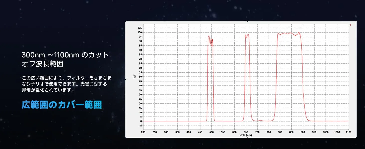 波長範囲は300 mm ~ 1100 mmです。このマルチナローバンドフィルターのカバー範囲は広く、光害に強い性能を発揮します。