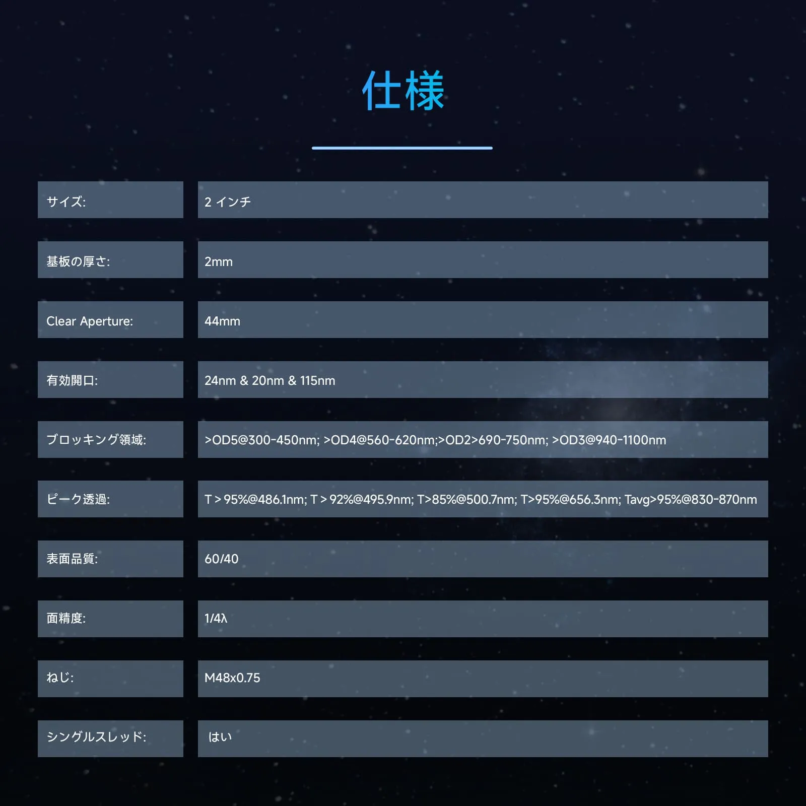| ピーク透過率 | T>95%@486.1nm; T>92%@495.9nm; T>85%@500.7nm; T>95%@656.3nm; Tavg>95%@830-870nm |