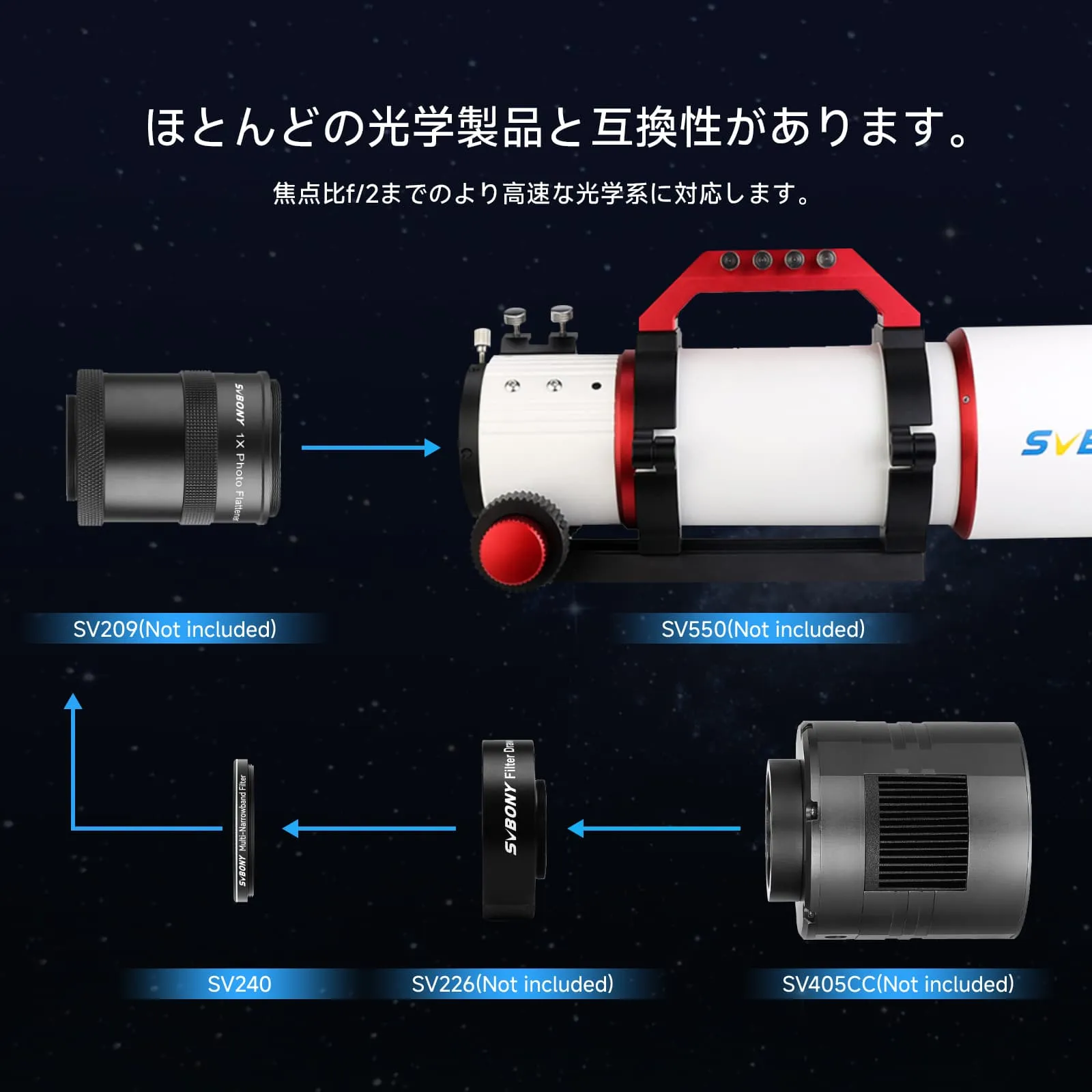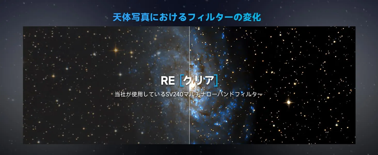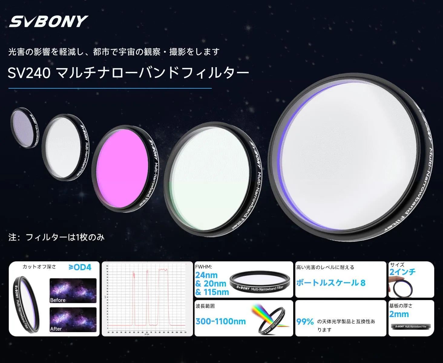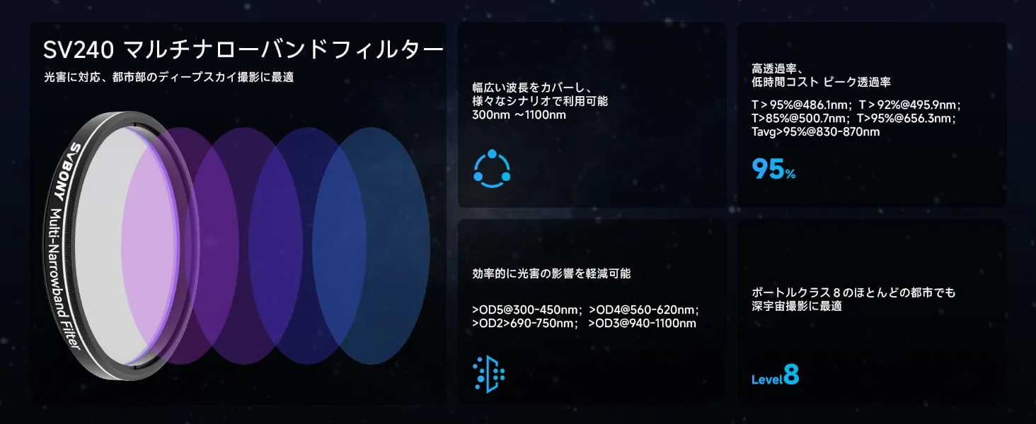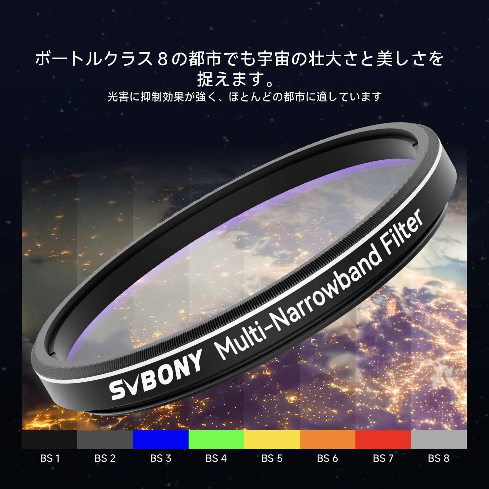 6 | ReviewsSV240 マルチバンドパスフィルターは、カットオフ深さ ≥ OD4により、都市の光害やその他の不要な人工照明や夜光をを効果的に遮断できます。ブロッキング領域≥OD4により、ボートルクラス1 ~ 8 の都市で使用できます。都市でより鮮明でコントラストの高い天体写真を撮影のを可能にします。