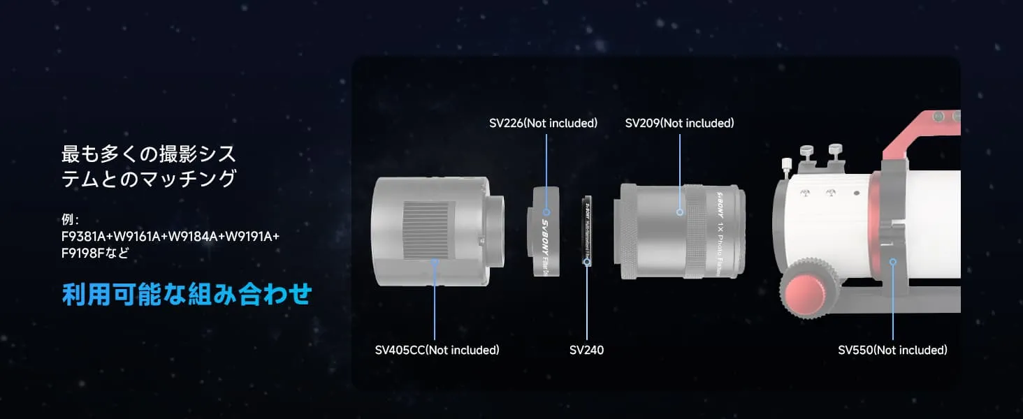 1. APO レンズの屈折望遠鏡または反射望遠鏡と組み合わせて使用するのをお勧めします。星像などの肥大招く可能性があるため、ED レンズの天体望遠鏡と組み合わせて使用のをお勧めできません。
