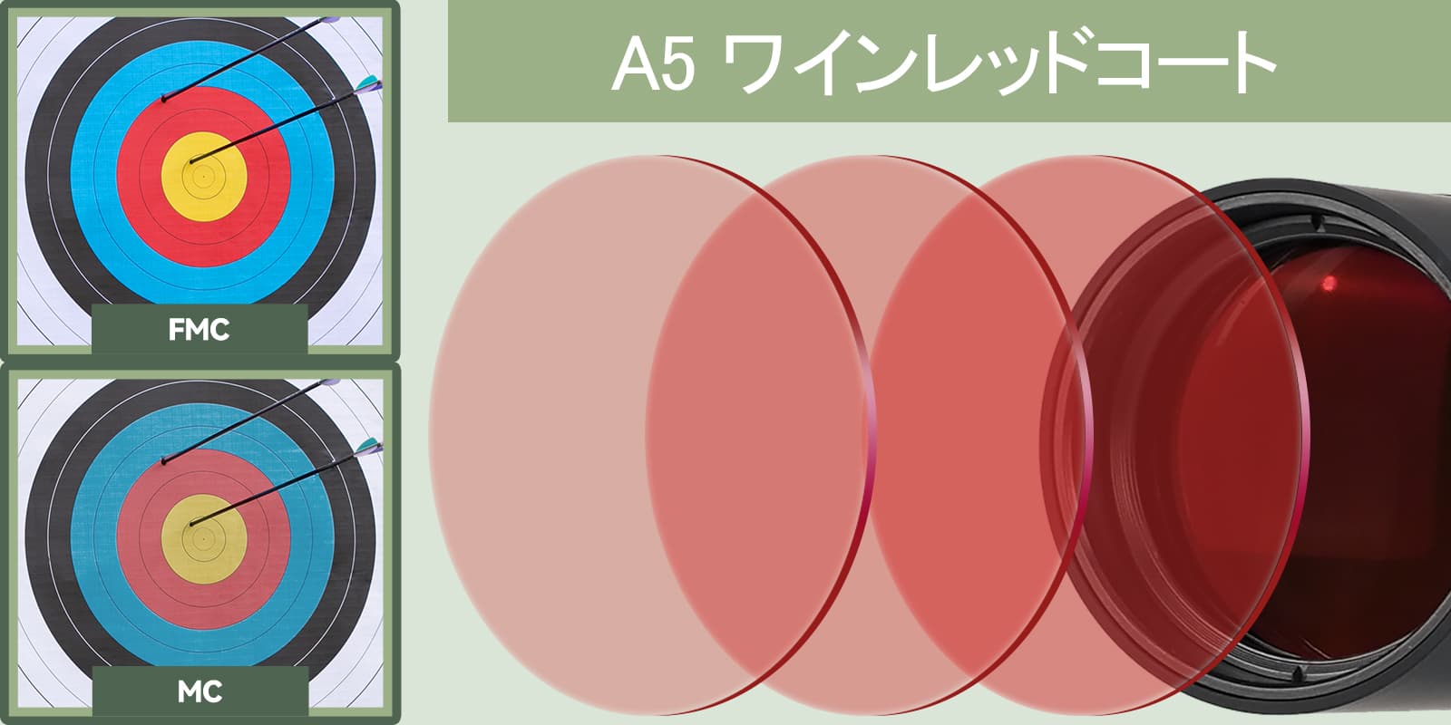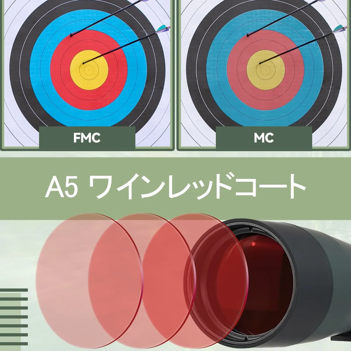 A5 ワインレッドコーティングにより、高い透過率が確保され、より明るくクリアな絞りが得られ、低照度条件下でも簡単に観察できます。