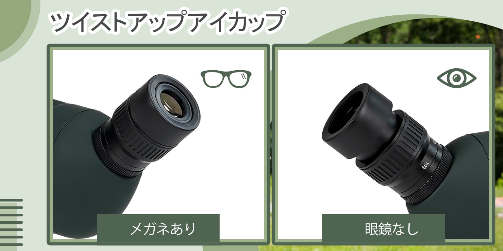 メガネをかけているかどうか。 ツイストアップアイカップで快適な観察位置を見つけることができます。