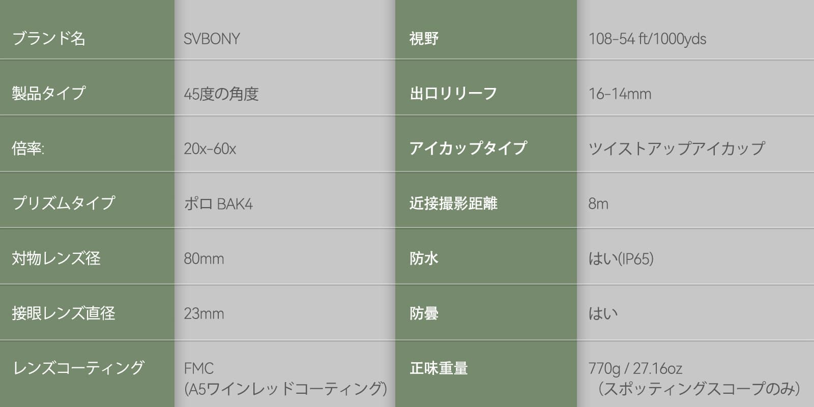 | 正味重量 | 770g / 27.16oz(フィールドスコープのみ) |
