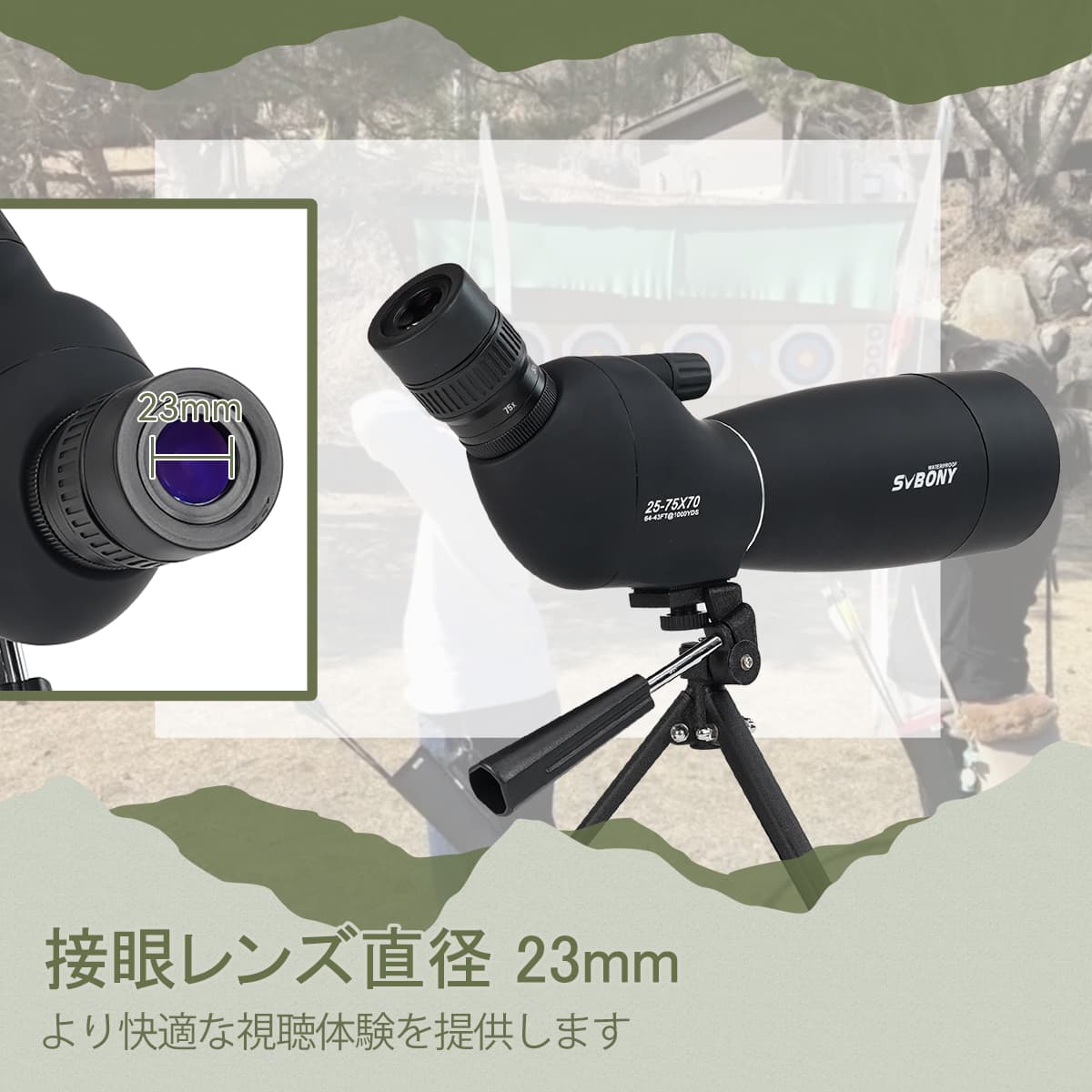 SV28PLUS 25-75x70 フィールドスコープ 23mm 接眼レンズ アーチェリーやターゲット観察に最適 卓上三脚付き