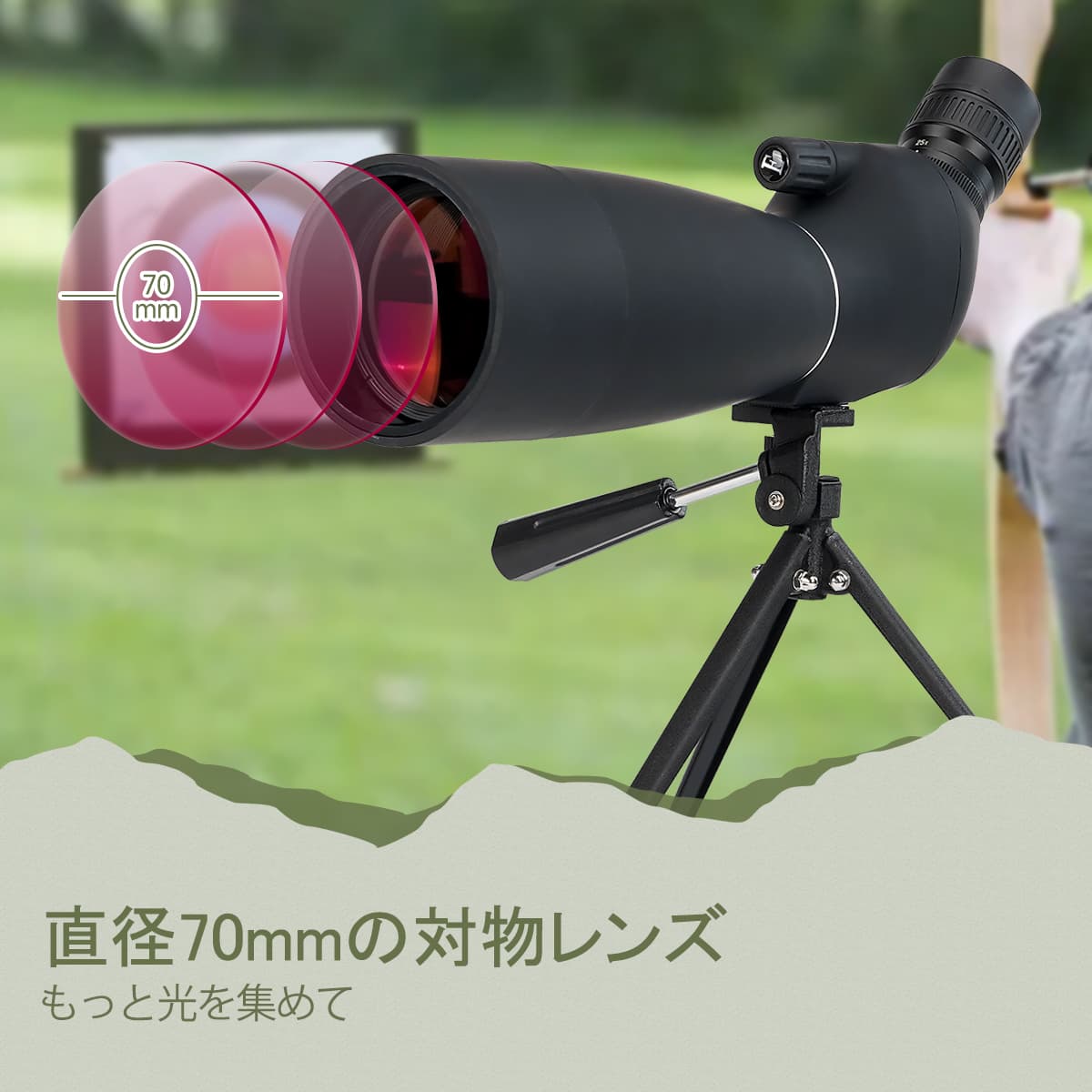 4.直径70mmの対物レンズ。 直径 70mm のスポッティング スコープ レンズの対物レンズは、より多くの光を集め、暗い環境でも明るい視野を実現します。