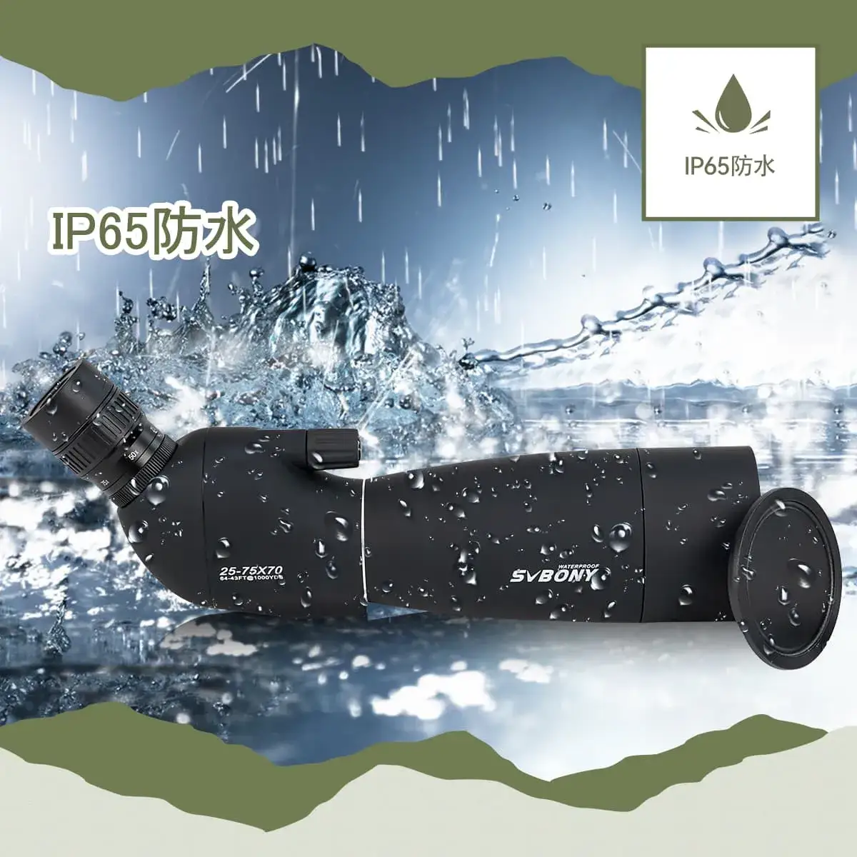6.IP65防水。 SV28PLUS スポッティングスコープを損傷するような突然の環境変化を回避できます。 一部の水の多い環境条件で利用可能。 霧雨の日に目標を観察します。