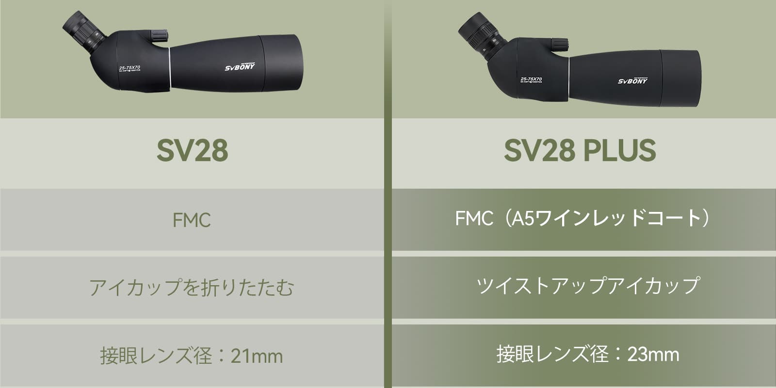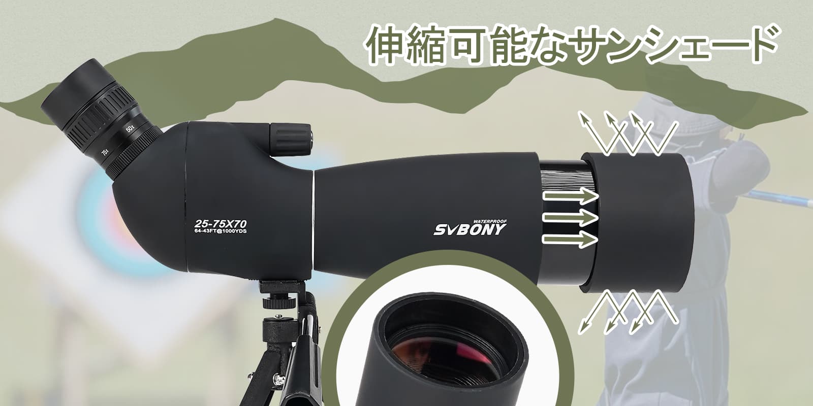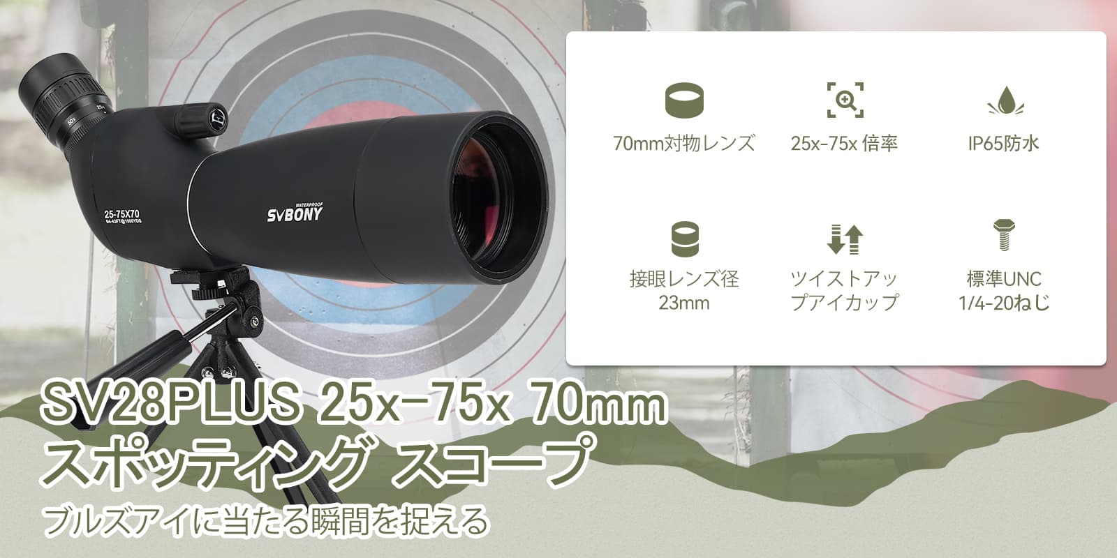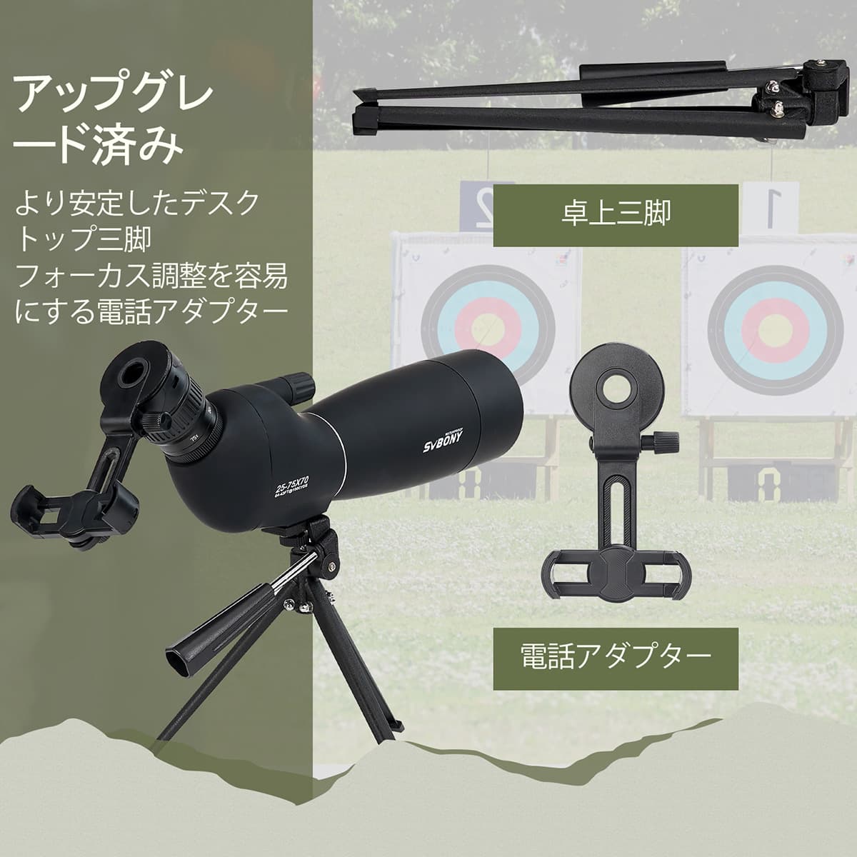 SV28 Plus 25-75x70 フィールドスコープ 23mm 接眼レンズ アーチェリーやターゲット観察に最適 卓上三脚付き