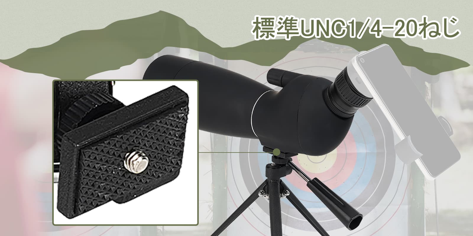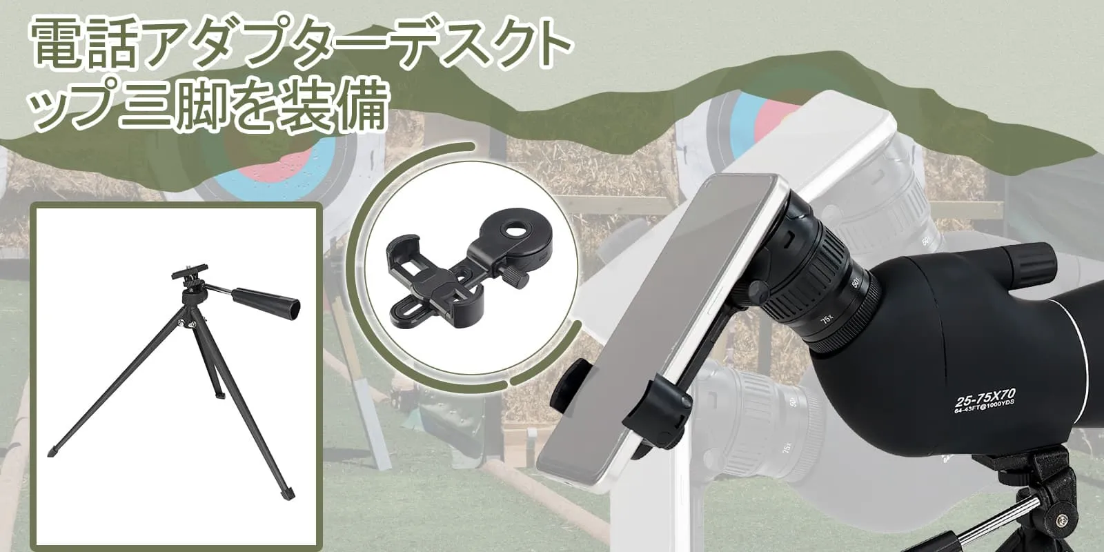 卓上三脚は範囲のスポッティングに最適です。 電話アダプターにより、写真やビデオの撮影がより便利になります。