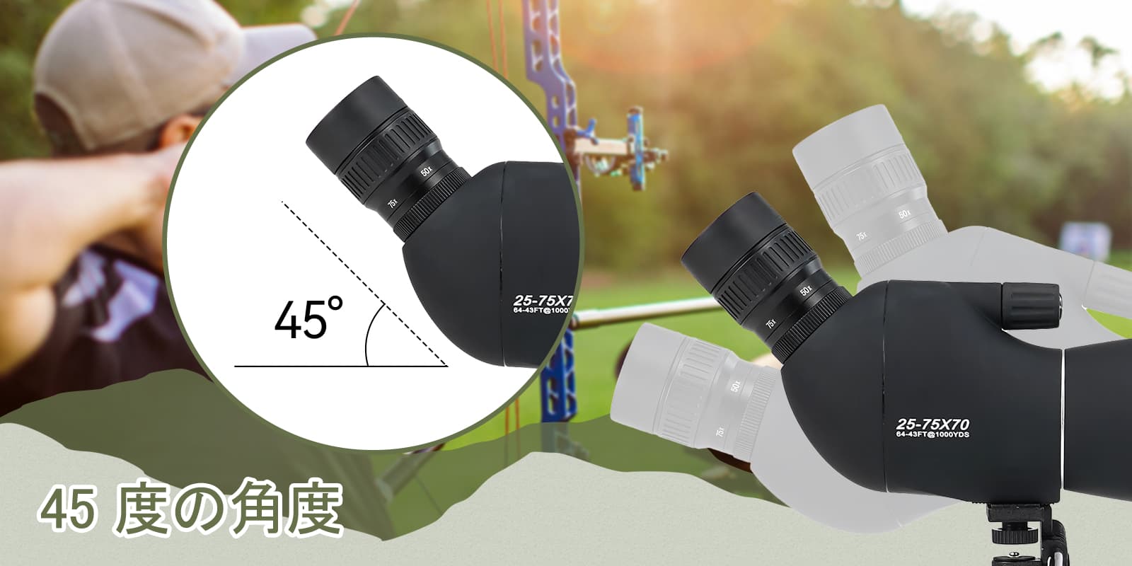 Write a review1.SV28PLUSフィールドスコープは、64-43 ft/1000ydsの広い視野と、25 倍から 75 倍まで倍率を調整できる強力なズーム倍率範囲を備えています。45度の角度の接眼レンズは、より快適な観察のために人間工学に基づいて設計されています。アーチェリーに最適します。