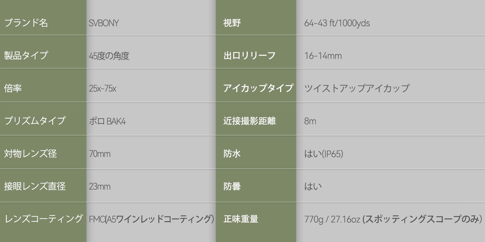 | 正味重量 | 770g / 27.16oz(フィールドスコープのみ) |