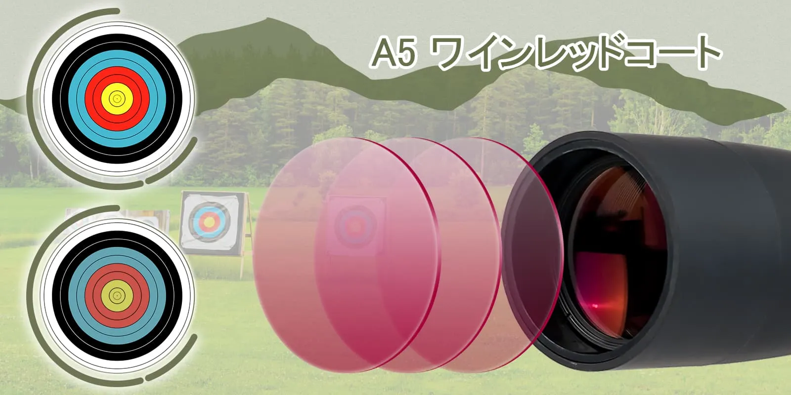 A5 ワインレッドコーティングにより、高い透過率が確保され、より明るくクリアな絞りが得られ、低照度条件下でも簡単に観察できます。