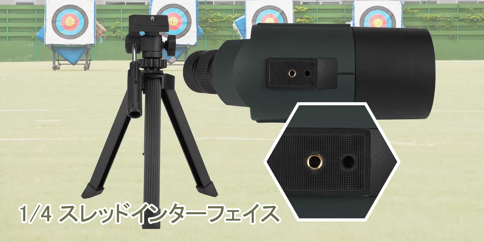 この製品のベースには、ファインダースコープを組み立てるためのネジ付きインターフェイス(1/4)が付属しています。 併用することで遠距離射撃や標的射撃にも使用可能です。