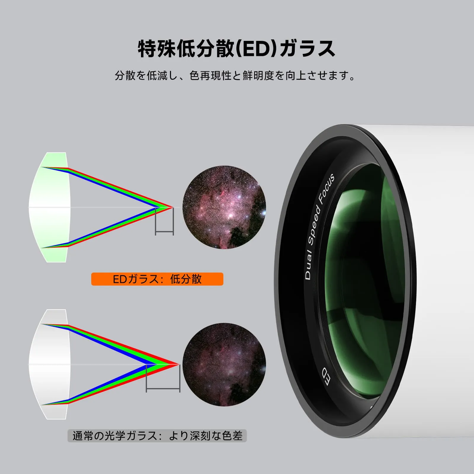 比類のない鮮明さ。EDガラスを搭載し、色収差を大幅に低減することで比類のない鮮明さを提供します。