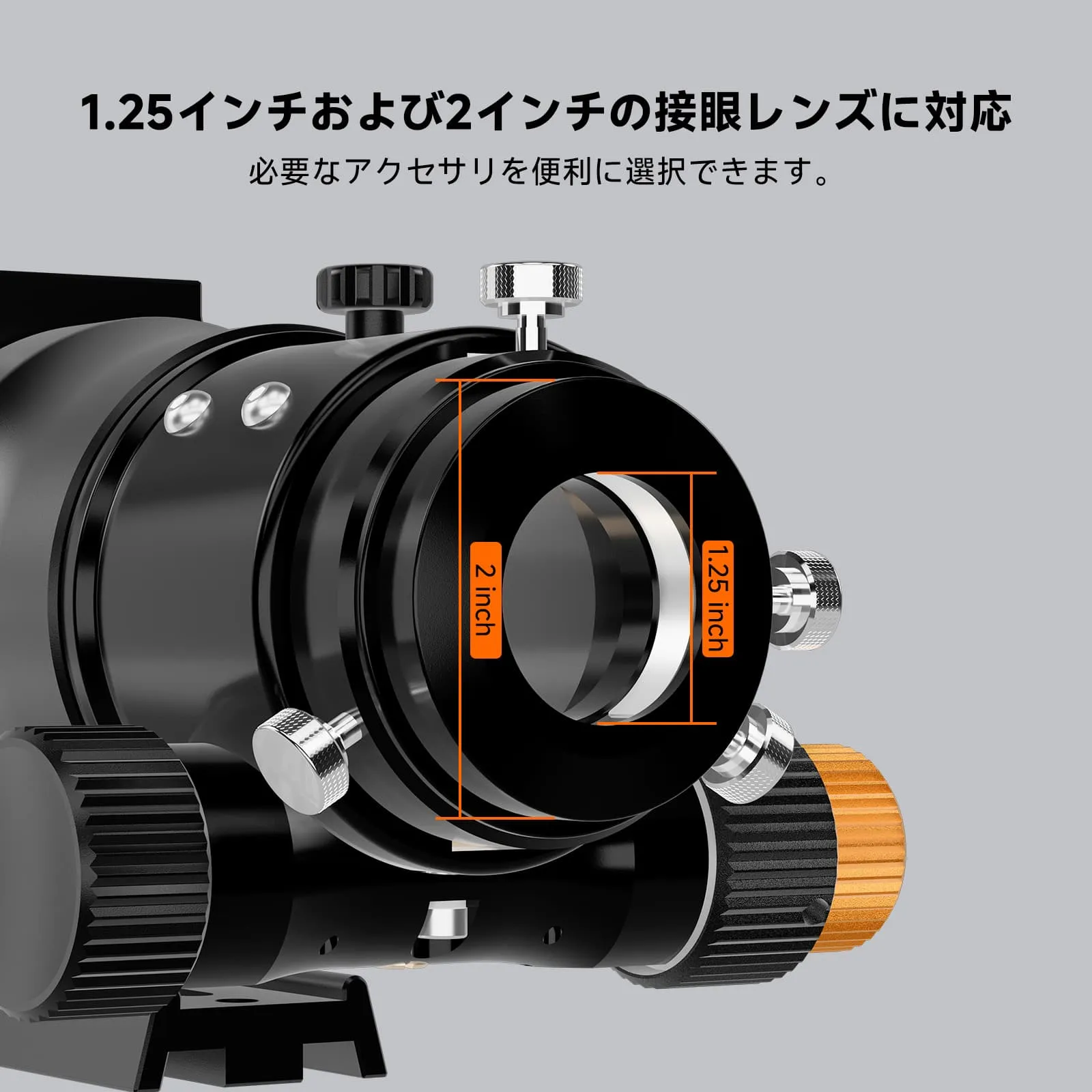 デュアルスピードフォーカサー。粗動(高速)と微動(低速)の2つのスピードでピント調整ができます。減速比は約1:10で、微細なピント合わせが必要な天体写真撮影や高倍率観測時に役立ちます。