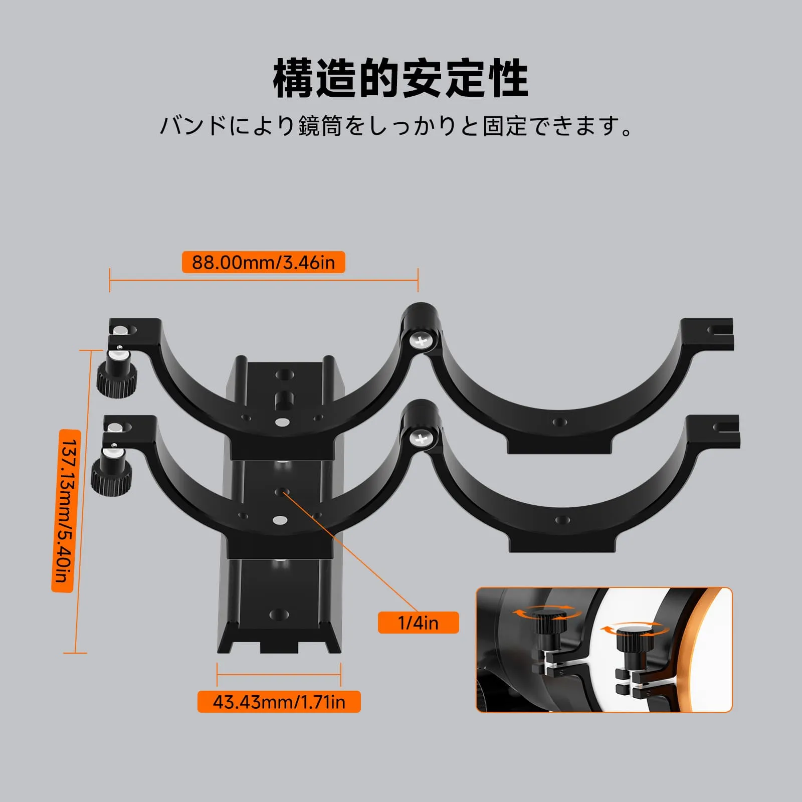 堅牢な安定性。望遠鏡チューブをしっかりと固定することで揺るぎない安定性を確保し、使用中のぐらつきや振動を排除します。