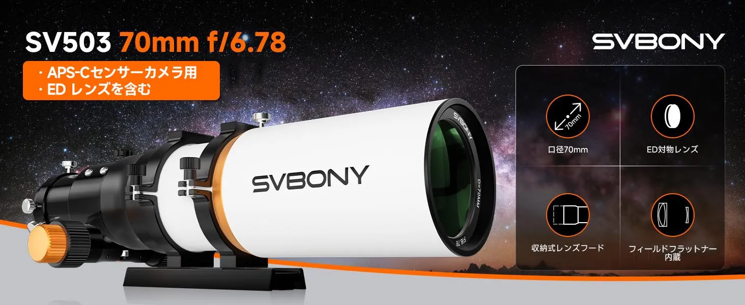 SV503 70mm望遠鏡アップグレード版 ED レンズを含む フラットフィールド設計 APS-Cセンサーカメラ用 月や惑星の観測・写真撮影、星雲・星団の撮影