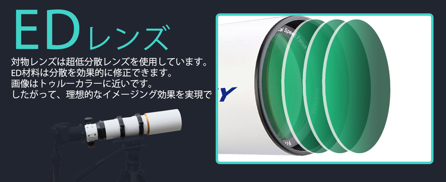 EDレンズを使用した天体望遠鏡で、屈折率が低く分散が小さいうえに、色収差を大幅に除去できます。コントラストの高い画像を実現しています。