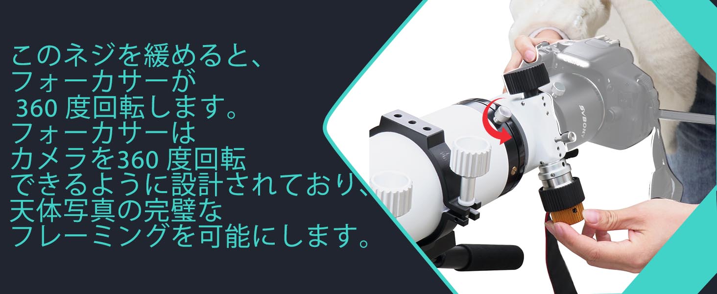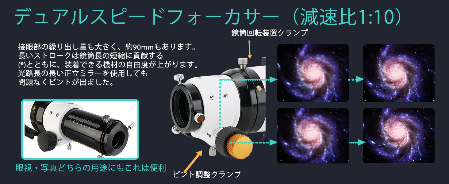 本体に採用されているフォーカサーは減速比1:10で、微細なフォーカス合わせが可能です。また、接眼部の繰り出しはラック&ピニオン方式で、重量のある機材を装着した際の緩みやズレを防止出来ます。アダプターは2インチスリーブと1.25インチスリーブの変換アダプタ2個が付属します。