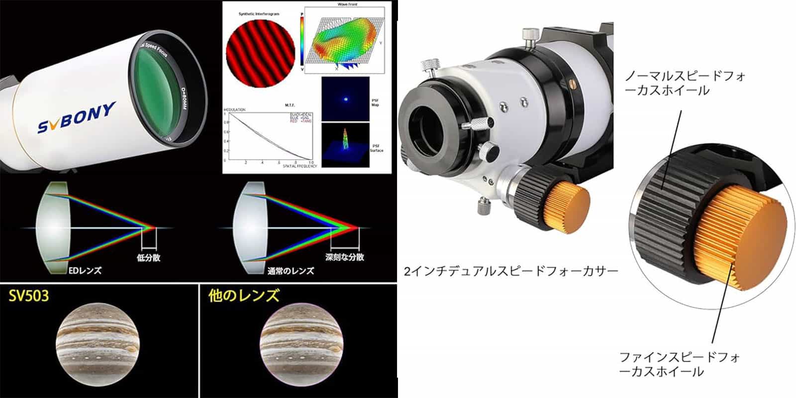 特殊な硝子材で高性能な対物レンズ「EDレンズS FPL-51」を1枚使用しているので、通常の光学ガラスと比較すると「色収差」が大幅に補正され、また、解像度やコントラストの高い星像を楽しむことが出来ます。