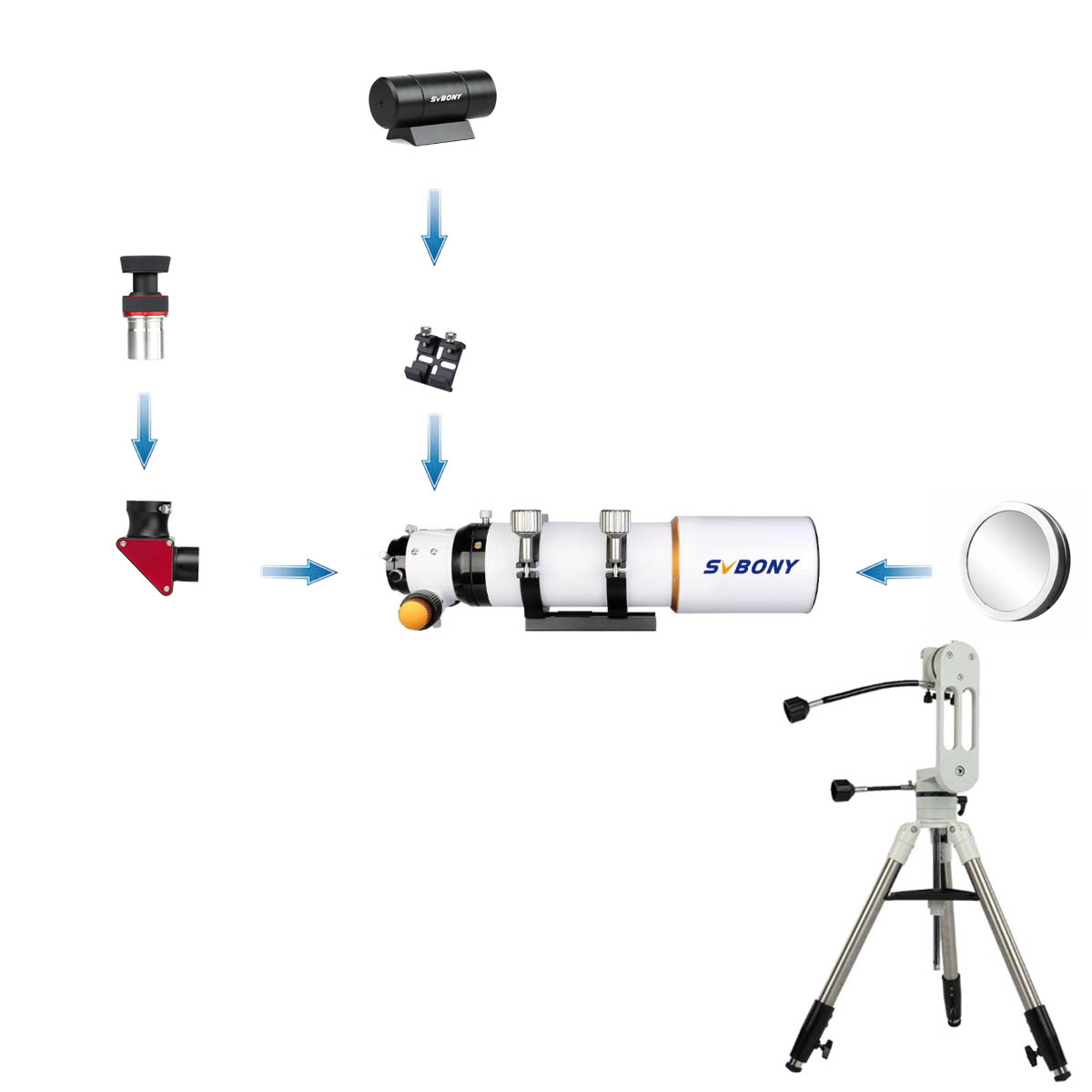レビューを書くSV503シリーズ望遠鏡太陽観測キット。このキットには、望遠鏡鏡筒、ファインダー、天頂ミラー、SV215ズーム接眼レンズ、経緯台、三脚が含まれています。SV215ズーム接眼レンズは、焦点距離3mmから8mmまで対応しており、低倍率から高倍率まで、あらゆる太陽観測のニーズに対応します。
