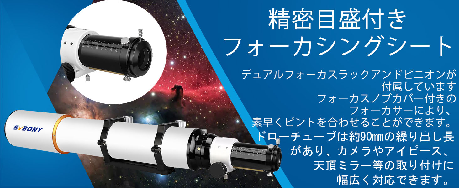 - 【デュアルフォーカス】SV503 102mm屈折望遠鏡には、定速と微速のフォーカスノブがあります。1:10のマイクロリダクションは天体撮影に最適で、さっそく正確な焦点合わせが可能です。2 "RAP(ラックアンドピニオン式)フォーカサーは、重い写真用アクセサリーを安全に配置することができます。