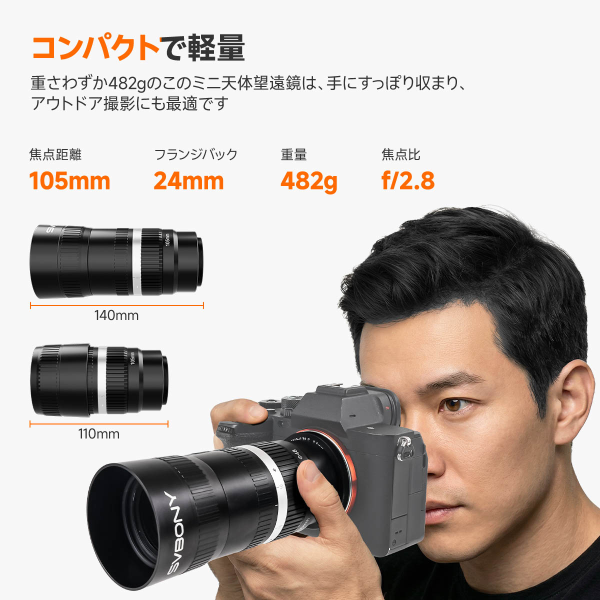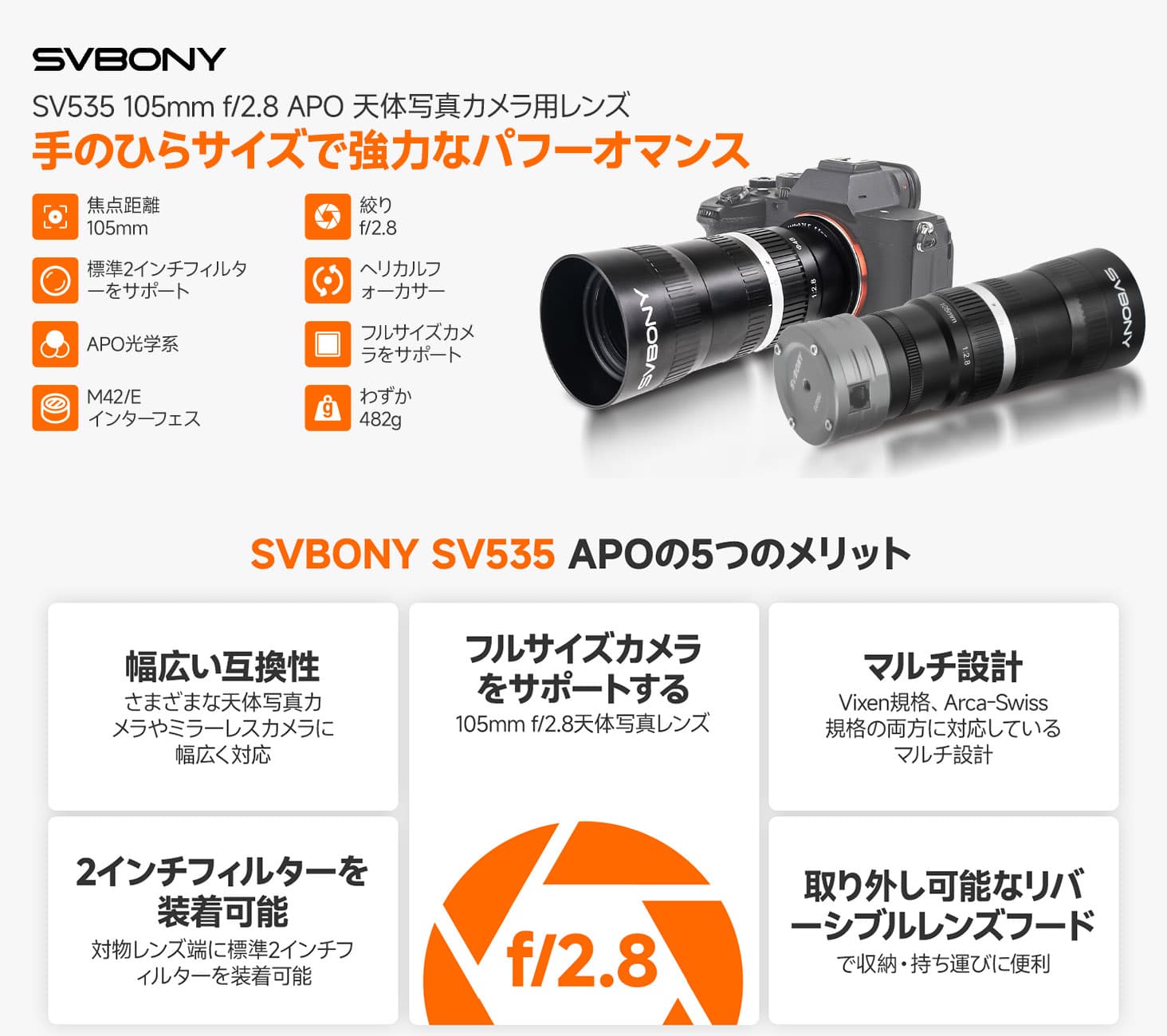 SV535 望遠レンズ APO 5枚7群 F2.8 焦点距離105mm 天体写真カメラ用レンズ M42/Eマウント付き 広視野 星景&深宇宙写真用