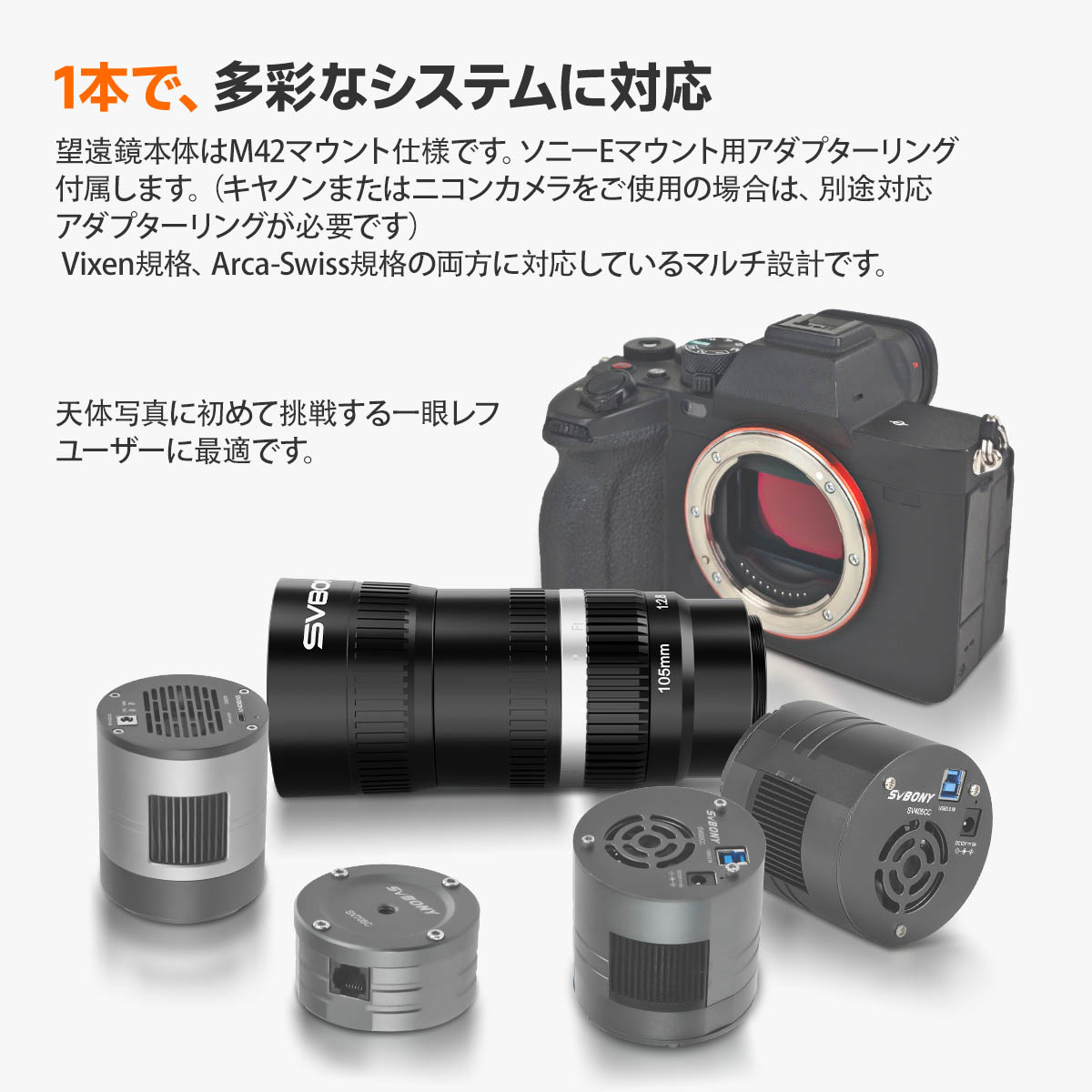 【高いシステム互換性】カメラ側は標準M42マウントを採用し、主要な天体カメラに対応しています。付属のアダプター(ソニーEマウント)や別売アダプターを使用すれば、ソニー・ニコン・キヤノンなどの一般的なミラーレスカメラにも接続可能で、既存機材を活用できます。