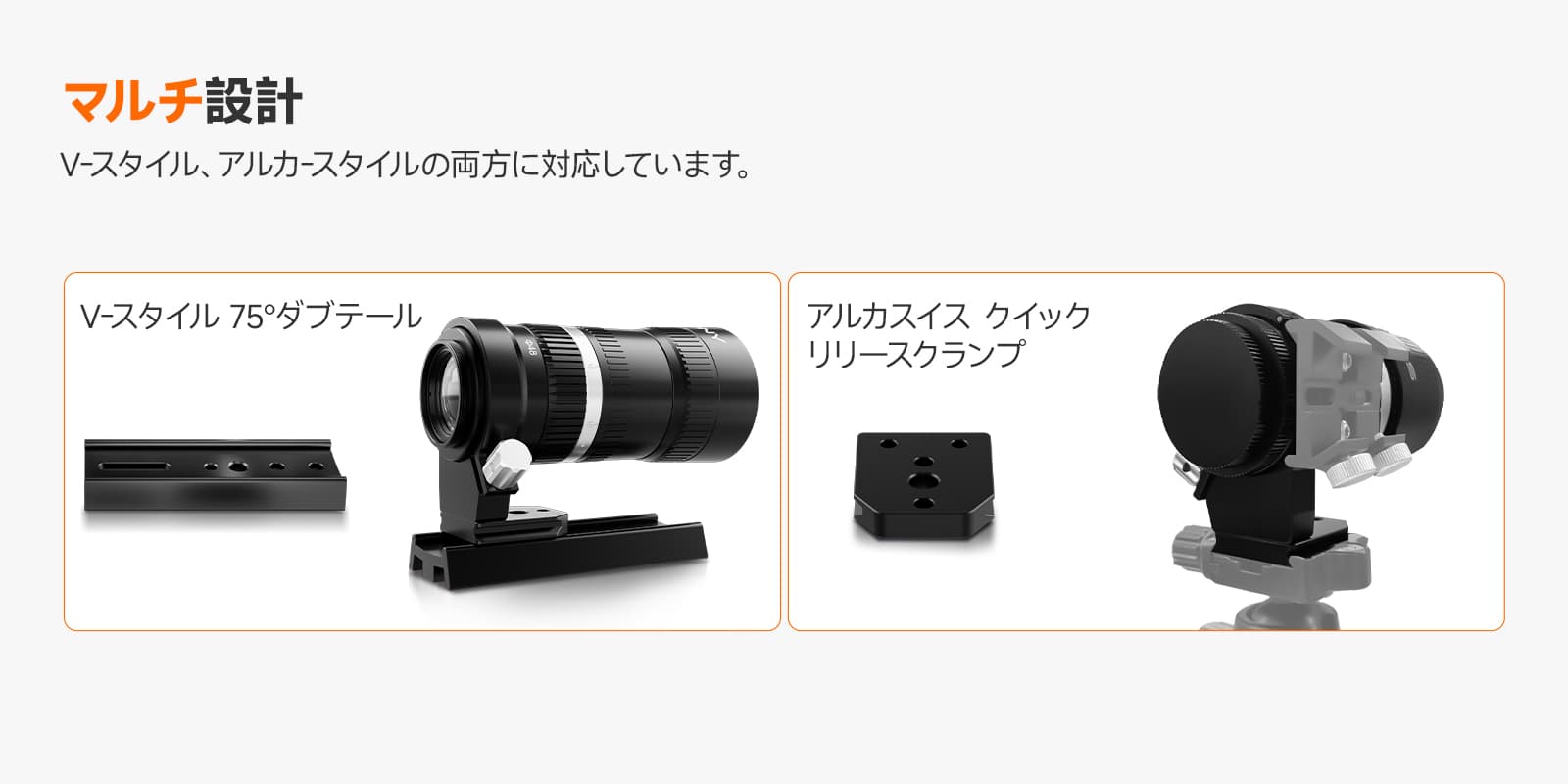 Vixen規格、Arca-Swiss規格の両方に対応しているマルチ設計です。天体望遠鏡、カメラ、三脚、架台など、異なるメーカーやブランドの機材を互換性を持って接続・運用できることで、機材選択の幅が広がり、柔軟なシステム構築やコストパフォーマンスの向上、使い勝手の改善が実現します。